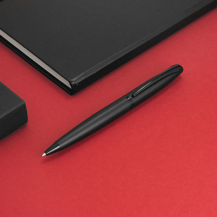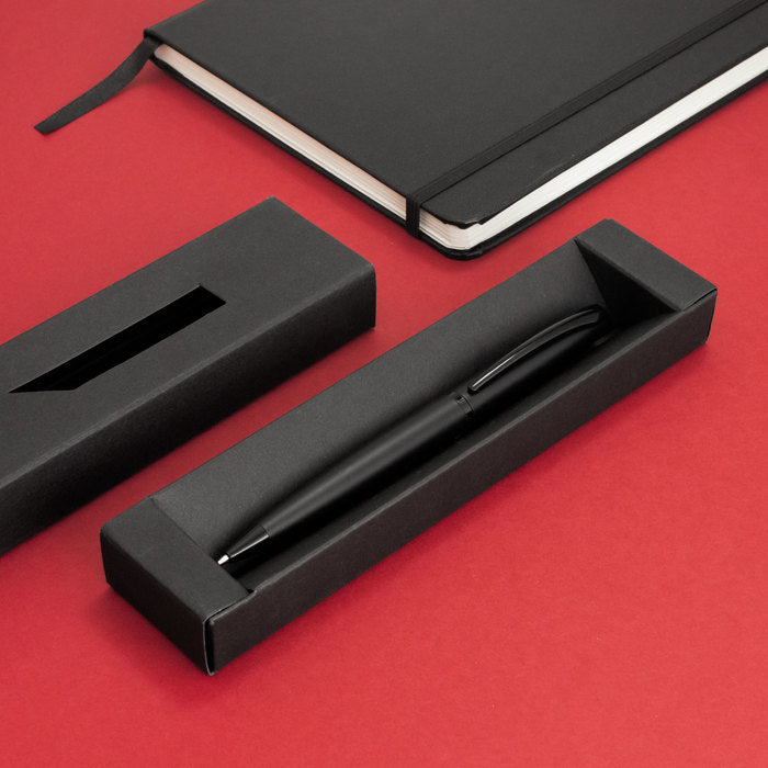 Integra refill metálico de origen alemán con tinta negra, garantizando flujo constante y escritura fina. El tambor superior con recubrimiento galvánico protege el brillo y resiste el uso intensivo. Con 13,5 cm de largo, 0,9 cm de diámetro y 24,5 g de peso, ofrece balance perfecto para firmas, reuniones y obsequios institucionales. Se entrega en caja de regalo lista para branding corporativo.
