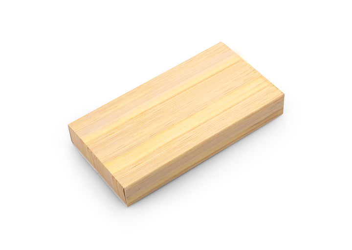 El estuche, forrado en papel con acabado imitación bambú, potencia la experiencia de entrega y refuerza el posicionamiento de marca.