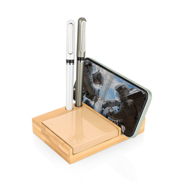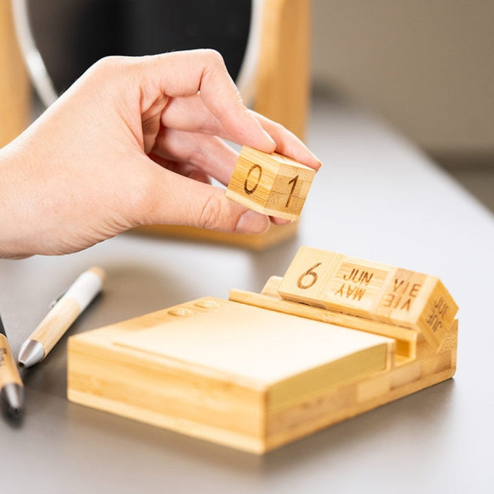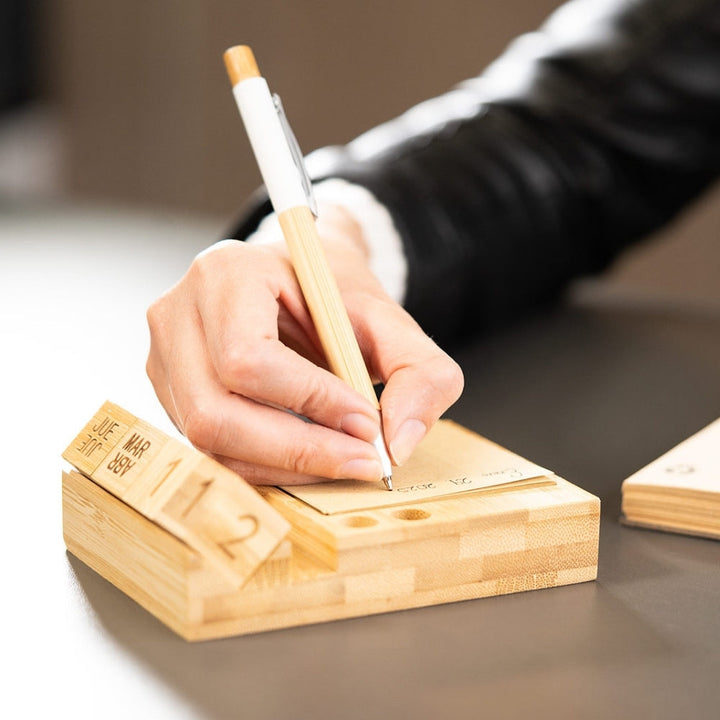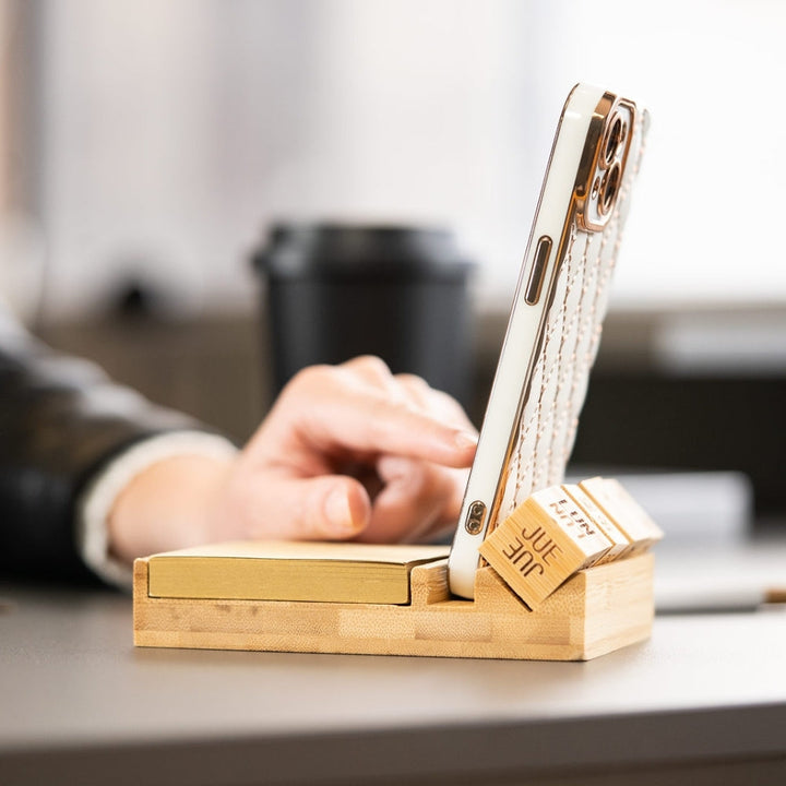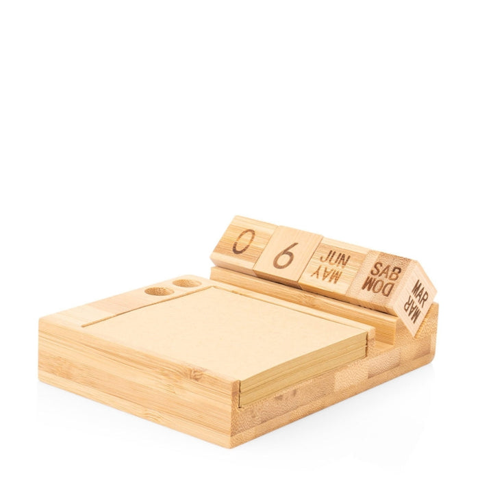 Porta notas ecológico fabricado en bambú natural con diseño multifuncional: incluye soporte para celular, calendario perpetuo en bloques giratorios y 100 hojas tipo kraft para anotaciones. Ideal para escritorios ejecutivos, kits de bienvenida o dotaciones con enfoque sostenible. Permite personalización mediante tampografía o grabado láser sobre el frente de la base.