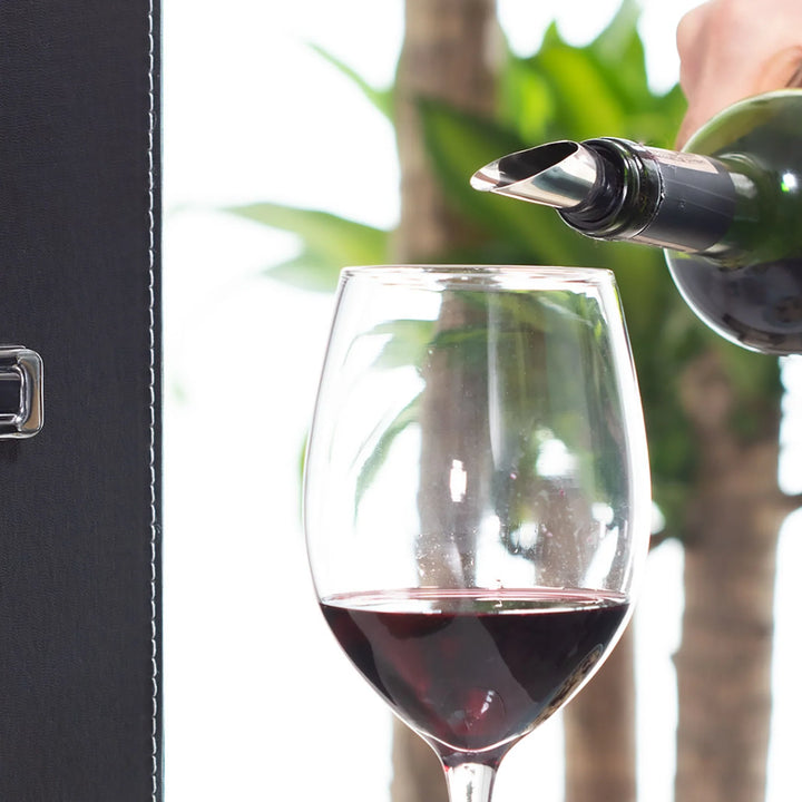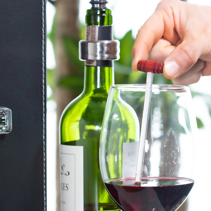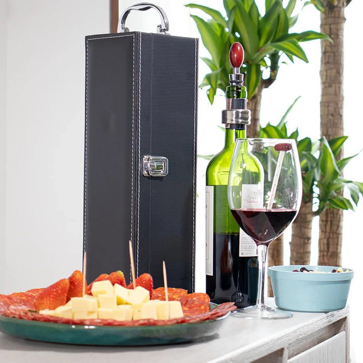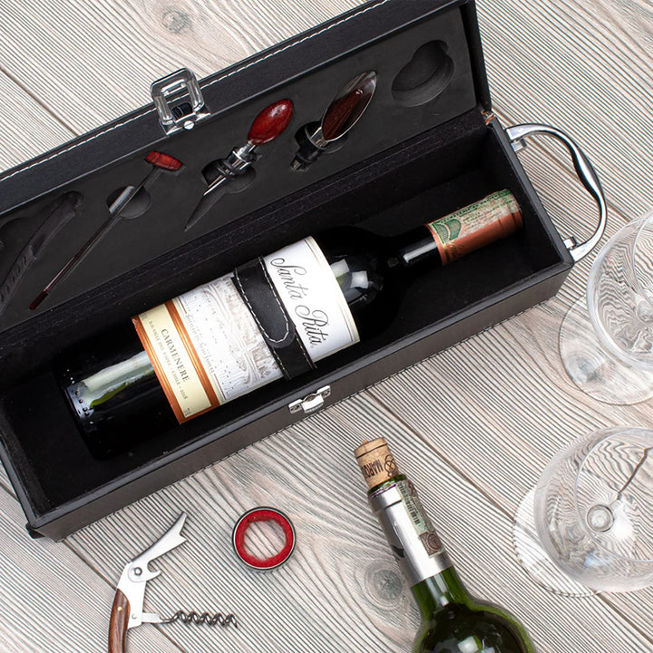 Una caja sofisticada para verdaderos conocedores del vino. Este elegante set contiene los 5 accesorios esenciales para servir con estilo: sacacorchos descapsulador, tapón metálico, cortagotas, aro antigoteo y termómetro, todos con apliques en madera y organizados dentro de una caja rígida forrada en cuero PU. El regalo ideal para ejecutivos, aniversarios o experiencias VIP. No incluye botella de vino.