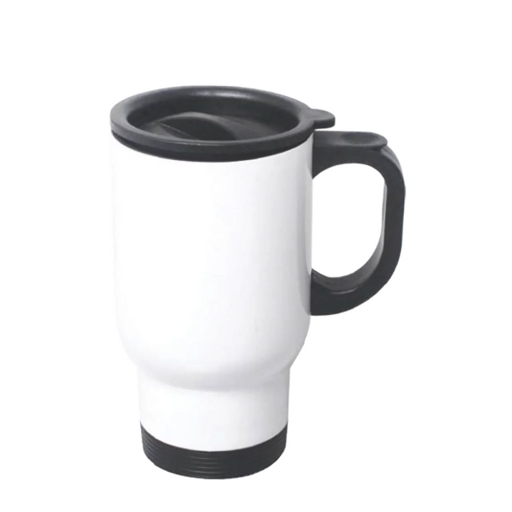 Termo de 450 ml con diseño funcional tipo mug, ideal para el carro gracias a su base cónica que se ajusta perfectamente en portavasos. Disponible en versión sublimable (blanca) o en acero inoxidable (plateado), es una opción práctica para campañas promocionales o regalos corporativos personalizados. Incorpora tapa plástica con abertura deslizable para beber fácilmente y asa lateral ergonómica.
