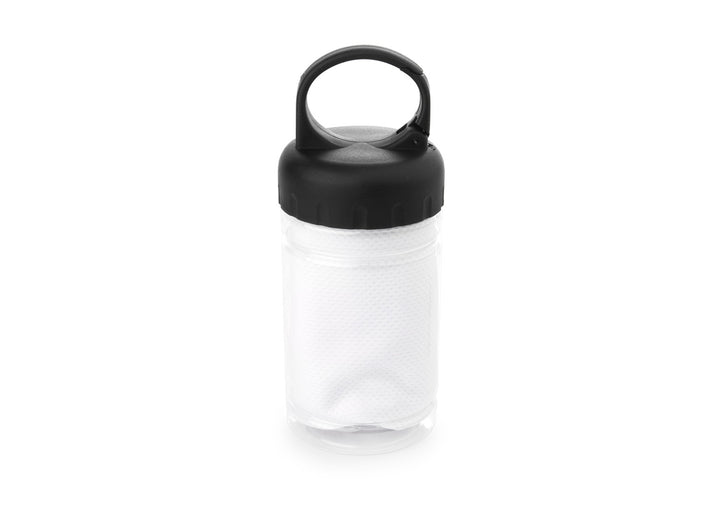 Incluye estuche rígido con gancho carabinero para llevar en mochila o cinturón, manteniendo la toalla limpia y lista para usar. Amplias zonas de personalización permiten integrar tu marca en el paño o en el contenedor.
