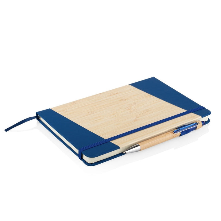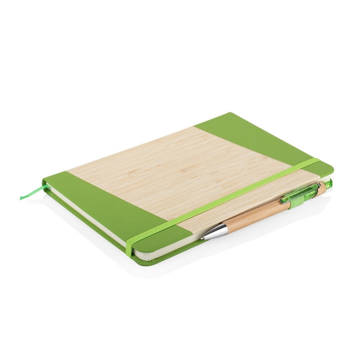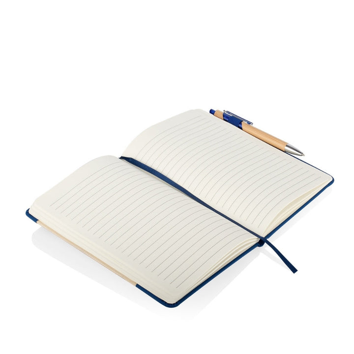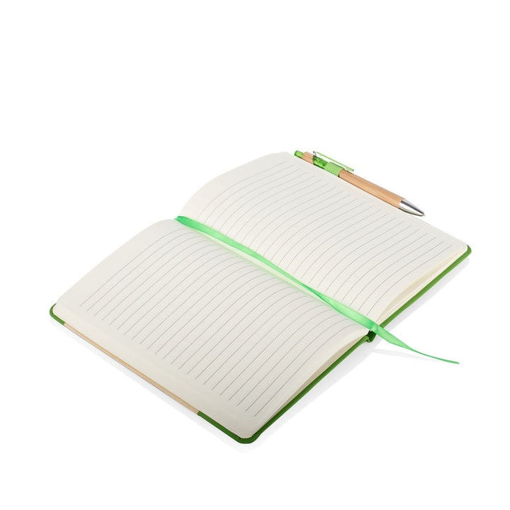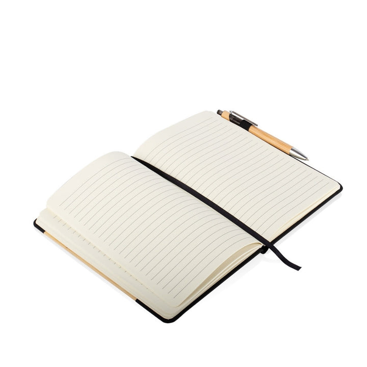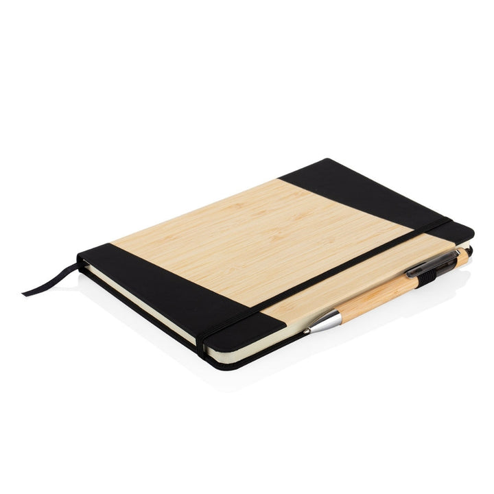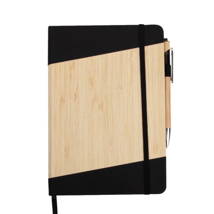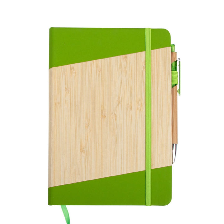 Libreta tamaño A5 con cubierta combinada en PU y bambú natural en diseño diagonal, ideal para uso empresarial, eventos promocionales y campañas con enfoque sostenible. Incluye 80 hojas rayadas, cinta marcadora, banda elástica de cierre y bolígrafo retráctil con cuerpo en bambú. Todos los elementos son aptos para personalización por láser, tampografía o serigrafía.