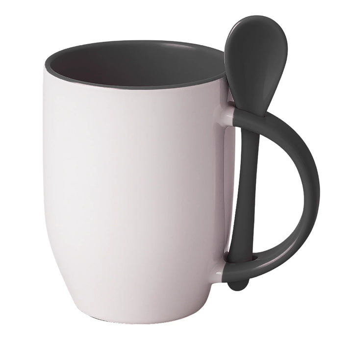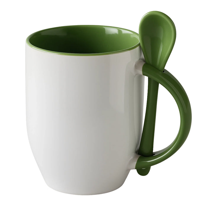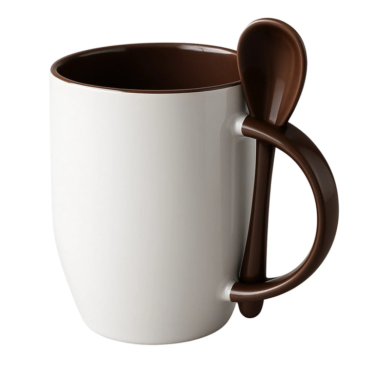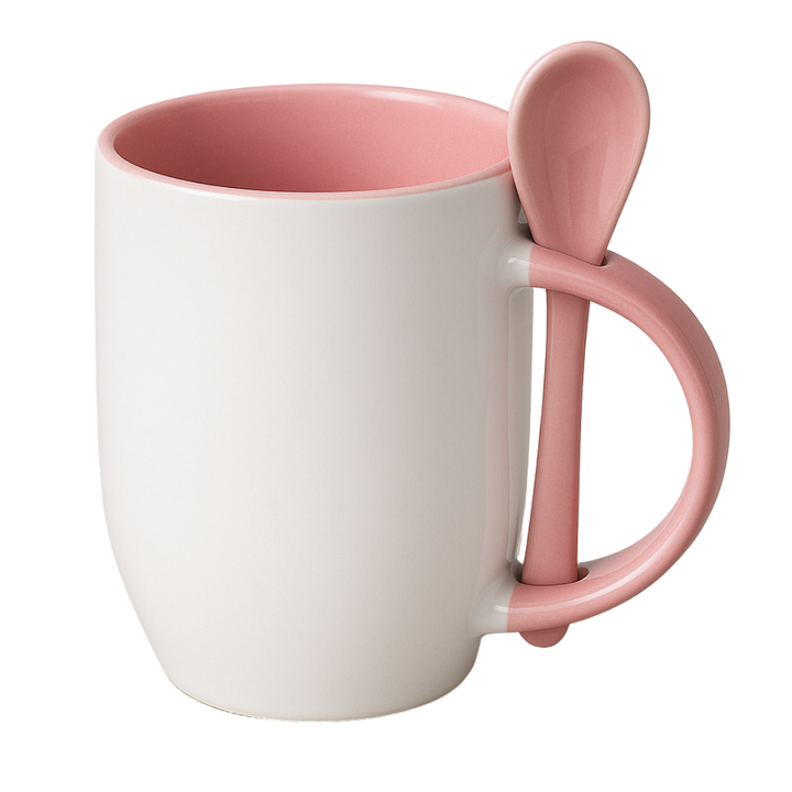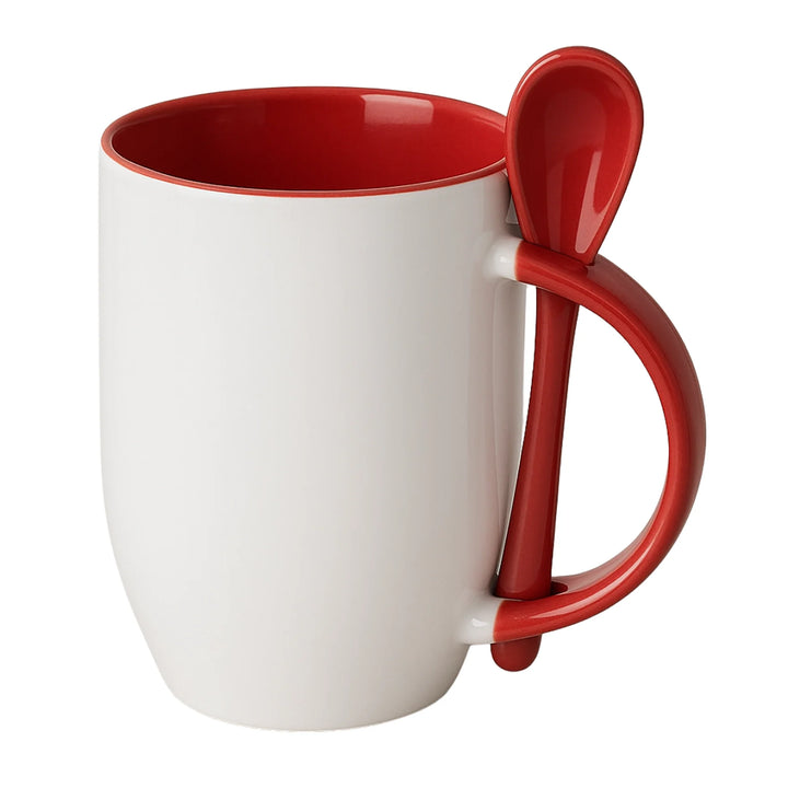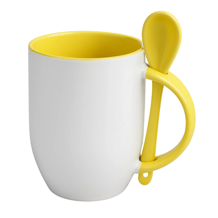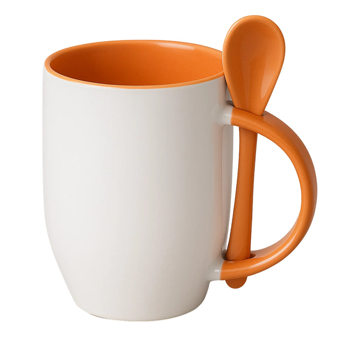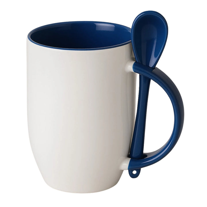 Mug sublimable en cerámica blanca de 12 oz con interior y cuchara a color. Diseñado para ofrecer una experiencia completa en el consumo de bebidas calientes dentro de entornos corporativos o como parte de kits promocionales. Su cuchara encajada en el asa mejora la funcionalidad sin comprometer la estética.