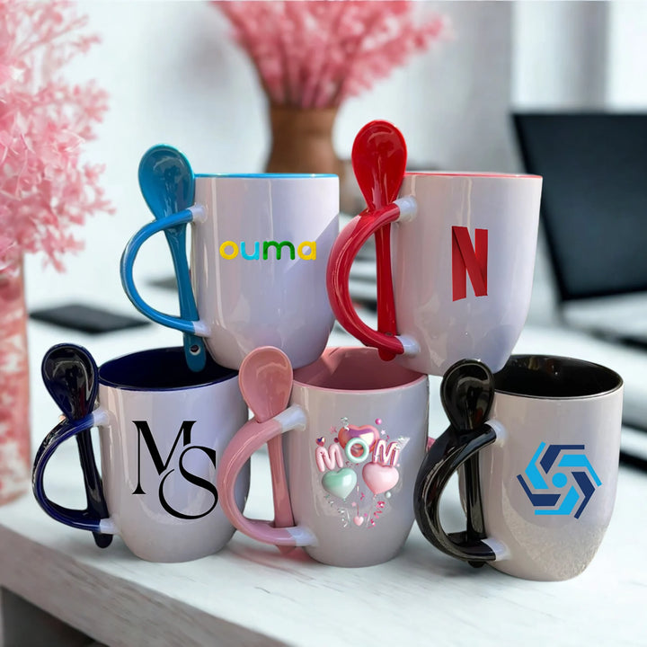 • Capacidad: 12 oz (aprox. 355 ml) • Material: cerámica blanca sublimable • Cuchara del mismo color del interior, encajada en el asa • Área de impresión recomendada: 20 × 9 cm • Medidas: Alto 9,5 cm × Diámetro 8 cm • Colores disponibles: negro, café, verde, azul oscuro, rojo, rosado, naranja, amarillo • Ideal para kits de regalo corporativo, cafeterías internas o branding institucional con toque práctico • Apto para microondas y lavavajillas