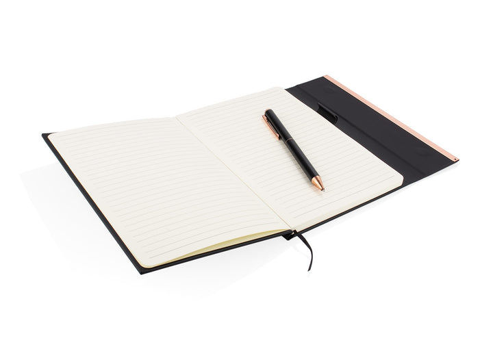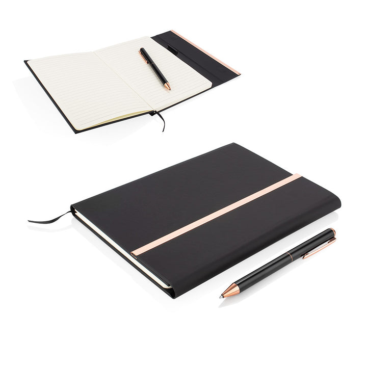 Incluye: Cuaderno tamaño A5 con hojas rayadas + bolígrafo metálico con clip