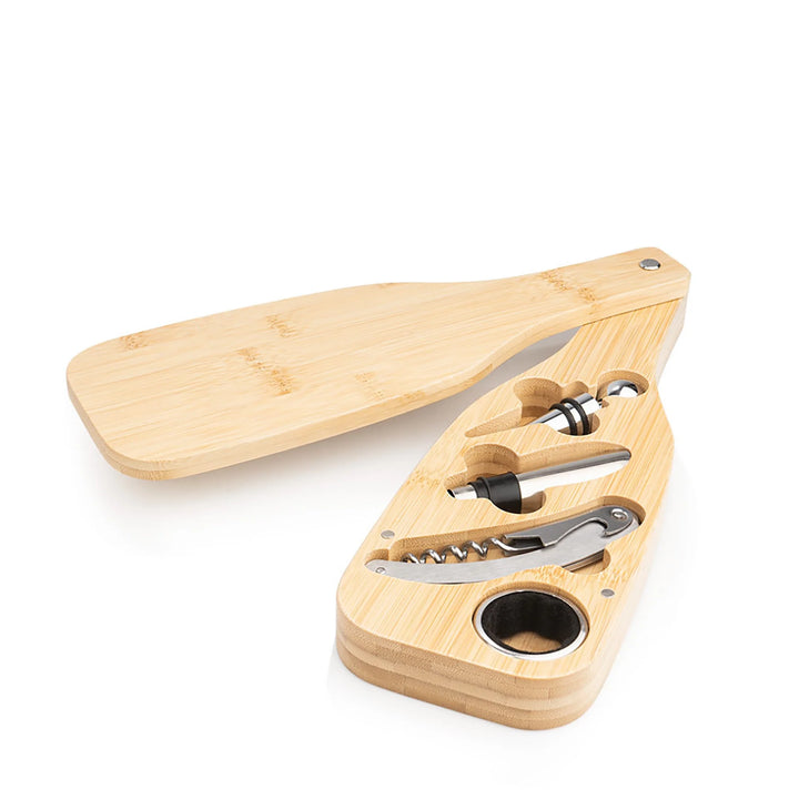 Diseñado con forma de botella, este set de vino elaborado en bambú es ideal para regalar o sorprender en cenas y eventos. Contiene todo lo necesario para una experiencia completa con vino: sacacorchos descapsulador, cortagotas, tapón metálico y aro antigoteo, todo en acero inoxidable y perfectamente dispuesto en una caja elegante y ecológica.