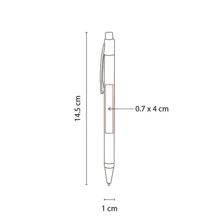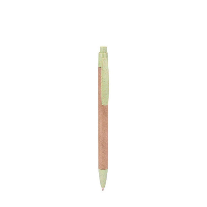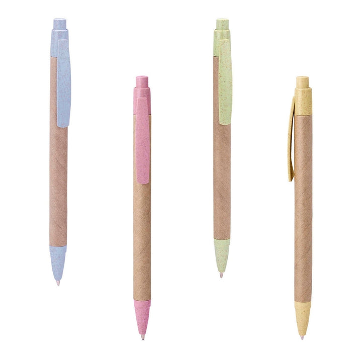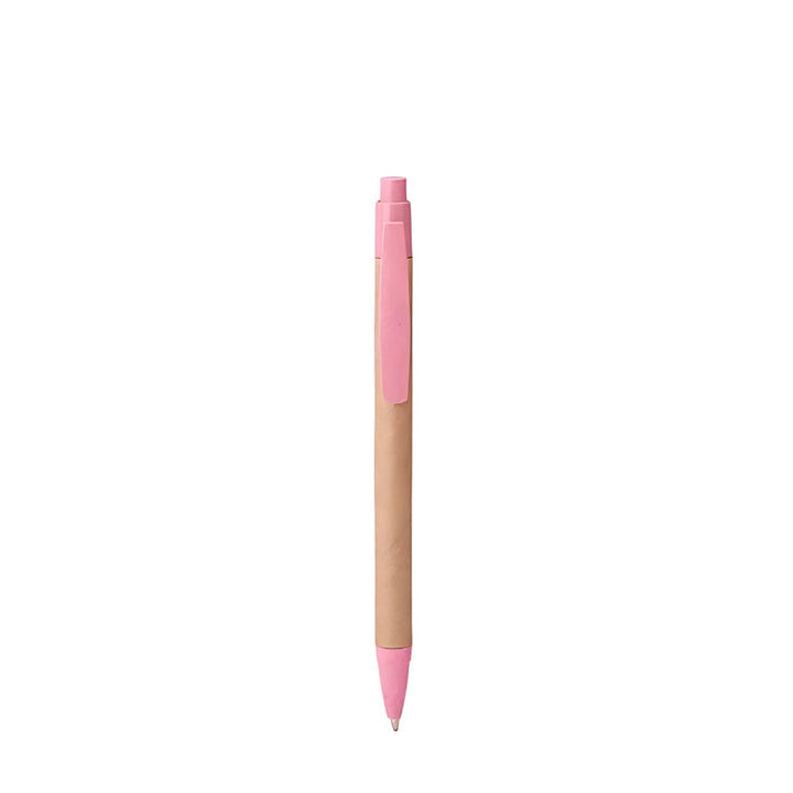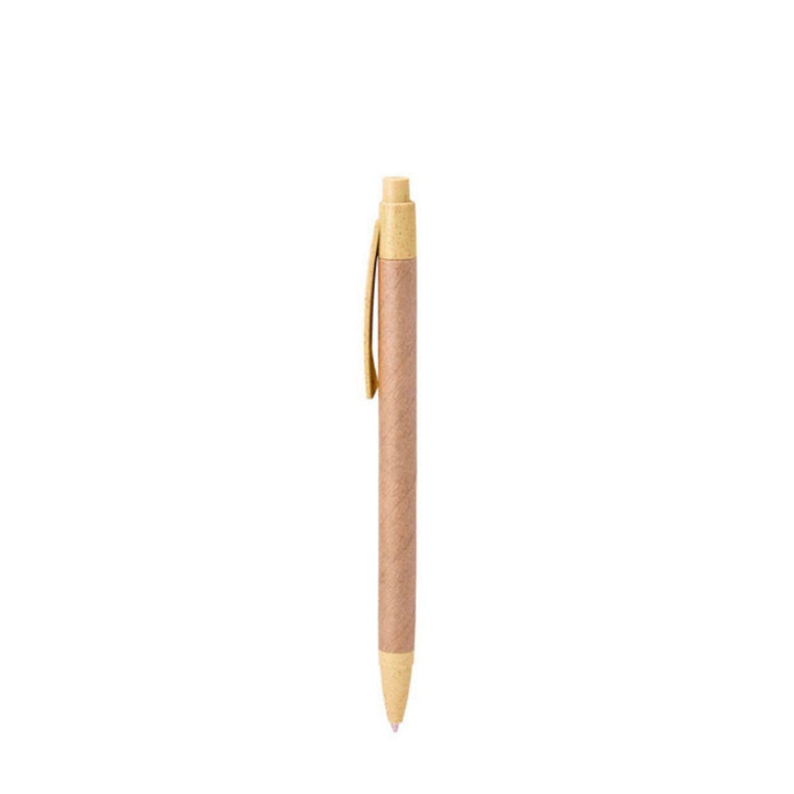Bolígrafo con cuerpo en cartón reciclado y componentes en plástico combinado con fibra de trigo, diseñado para campañas sostenibles y dotaciones empresariales con enfoque ecológico. Cuenta con mecanismo retráctil por pulsador y clip plástico para sujetar en carpetas o cuadernos. Apto para impresión en el cuerpo mediante serigrafía. Disponible en colores suaves que refuerzan su estética eco-responsable.