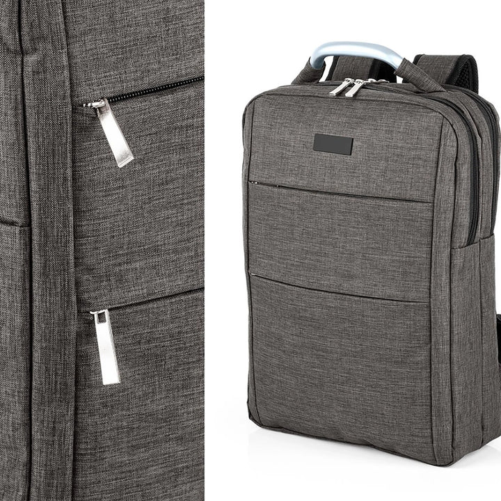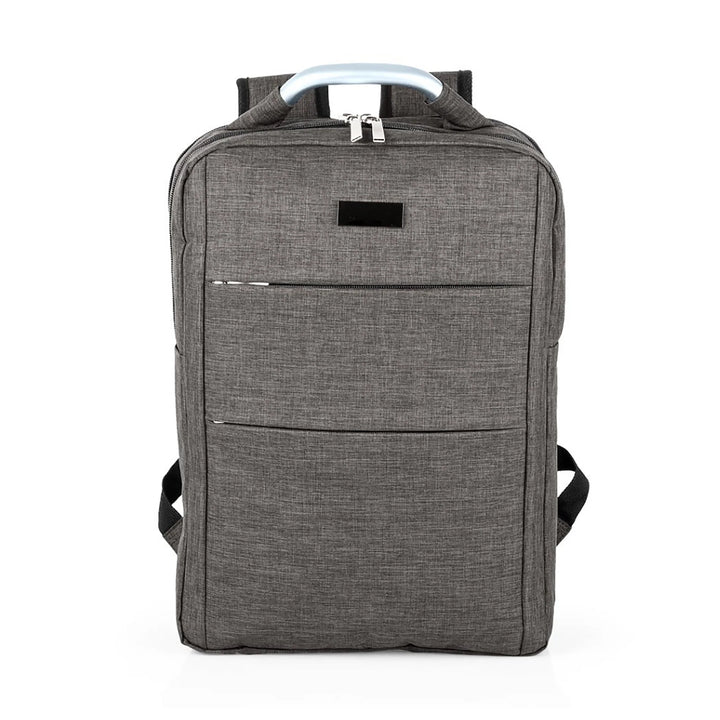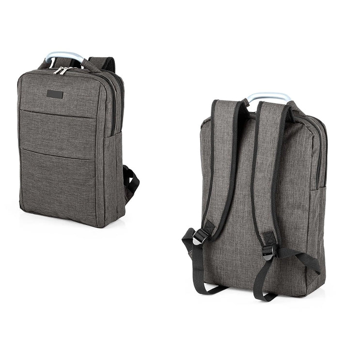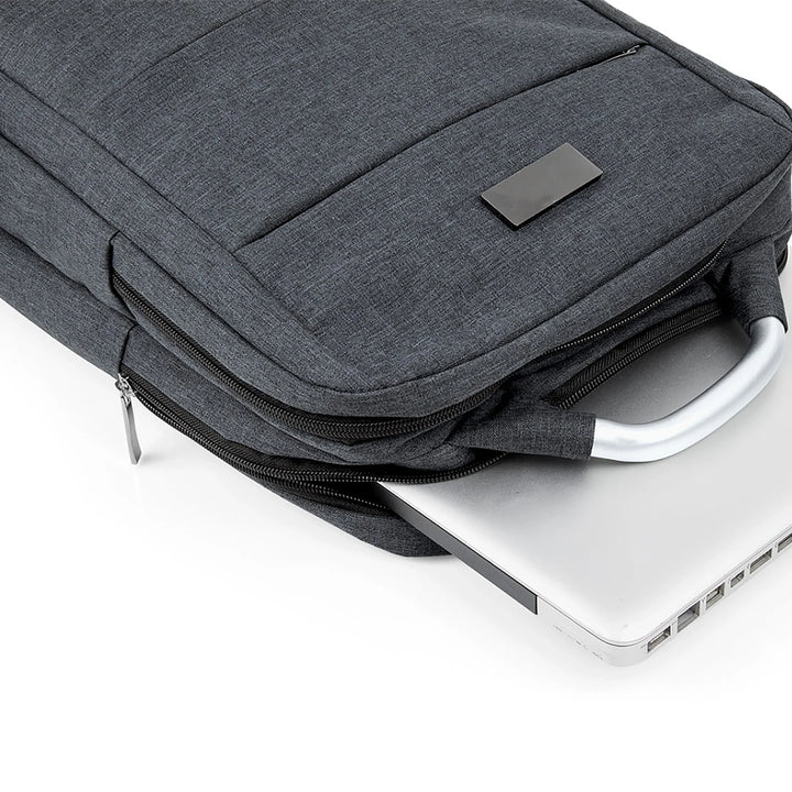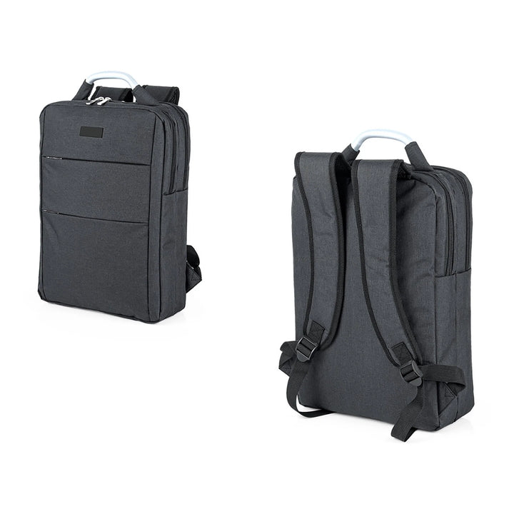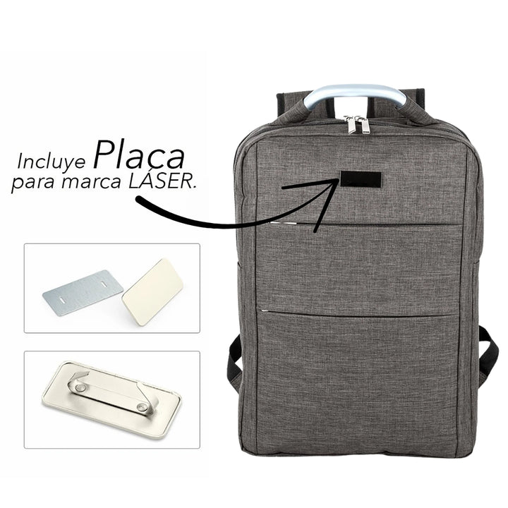 • Material: 100% Poliéster • Medidas: 29 × 40 × 11 cm • Peso unitario: 600 g • Agarradera superior en aluminio • Compartimento acolchado para laptop de hasta 14" • Bolsillo organizador con espacio para bolígrafo y libreta • Doble bolsillo frontal con cierre de cremallera • Incluye placa metálica para grabado láser (4.5 × 1.8 cm) • Técnica recomendada: Grabado láser • Colores disponibles: Café y Gris • Empaque individual en bolsa de polietileno