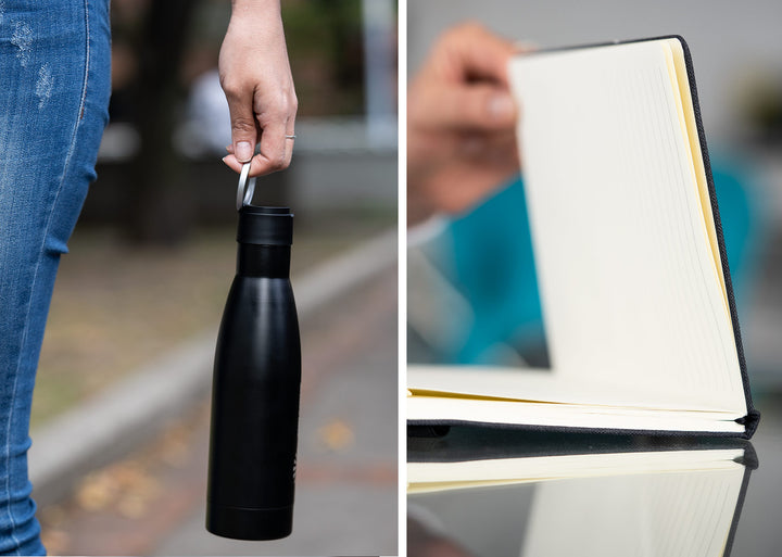 Materiales: Paraguas en tela Pongee 190T, libreta cubierta RPET, botella en acero inoxidable, bolígrafo de aluminio con cubierta RPET