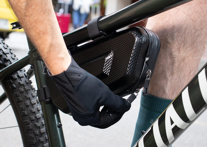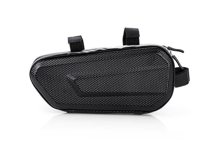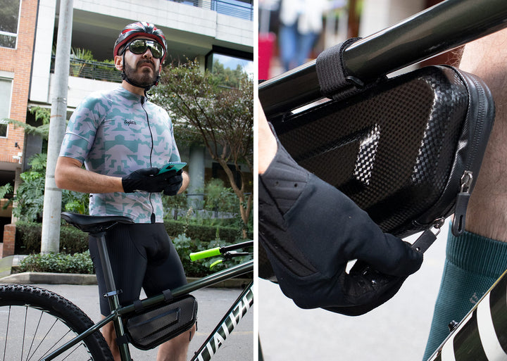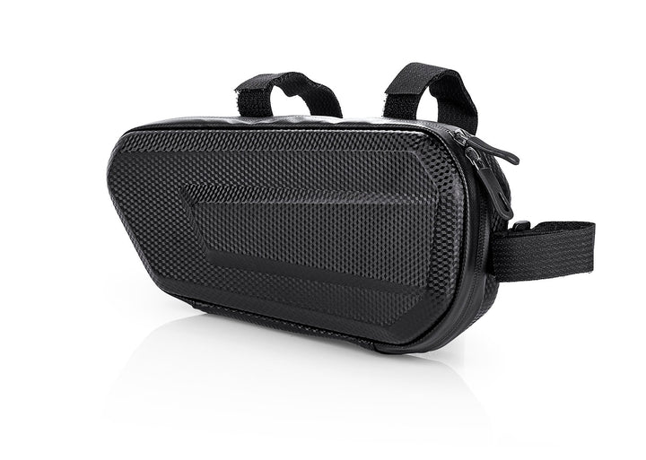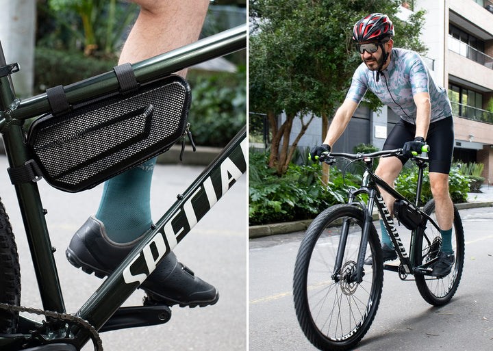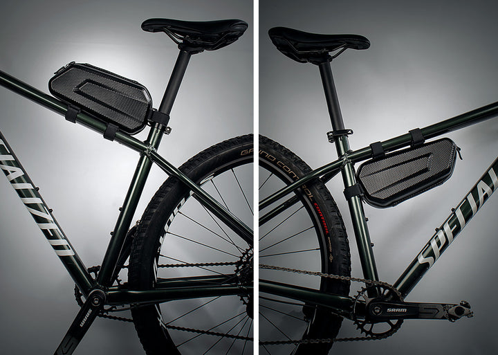 La FrameSafe Pro organiza y protege tus esenciales en ruta. Su estructura rígida con cierre impermeable mantiene el contenido a salvo de lluvia y salpicaduras, mientras las tres correas de anclaje la fijan con estabilidad al cuadro sin interferir con el pedaleo.