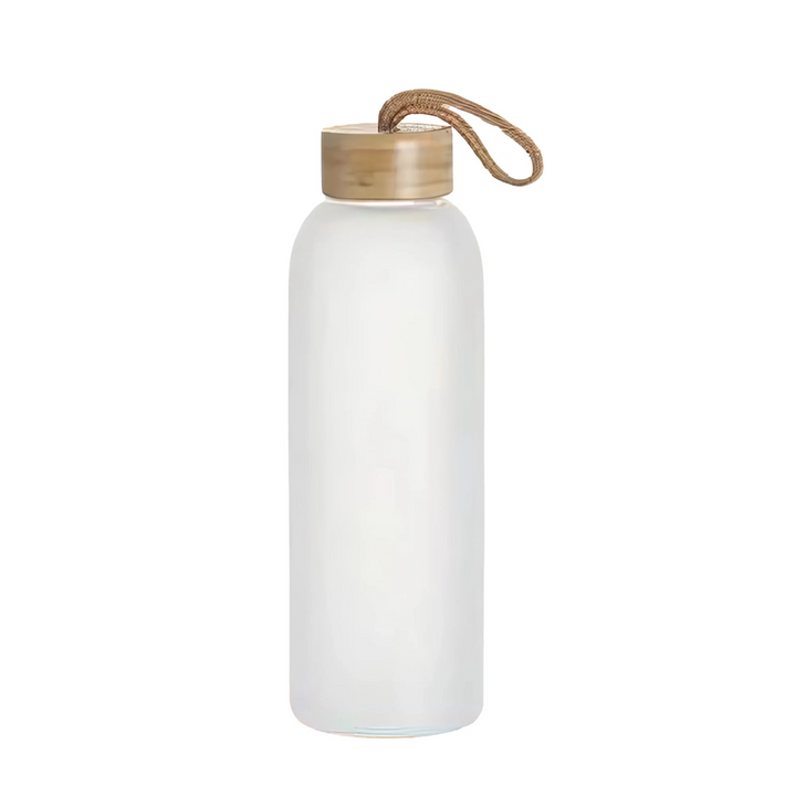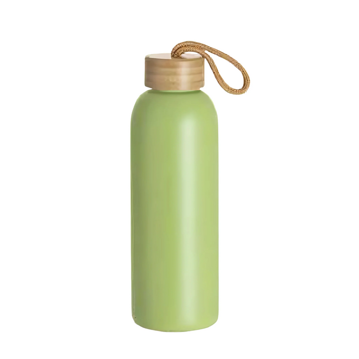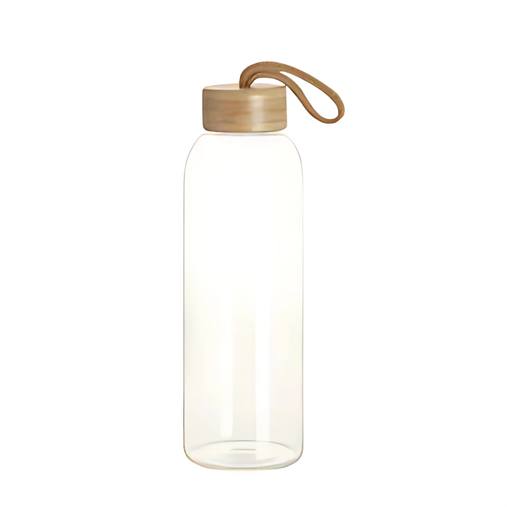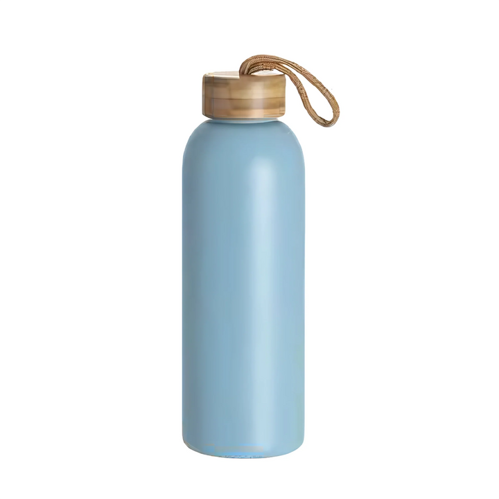 Botella de vidrio reutilizable de 750 ml con tapa roscada en bambú y cordón para fácil transporte. Disponible en múltiples acabados: azul, verde menta, verde claro, opalizado y transparente. Su superficie es apta para sublimación en colores claros y ofrece una presentación visual limpia y sostenible. Perfecta para campañas corporativas con enfoque ecológico, regalos premium o branding wellness.