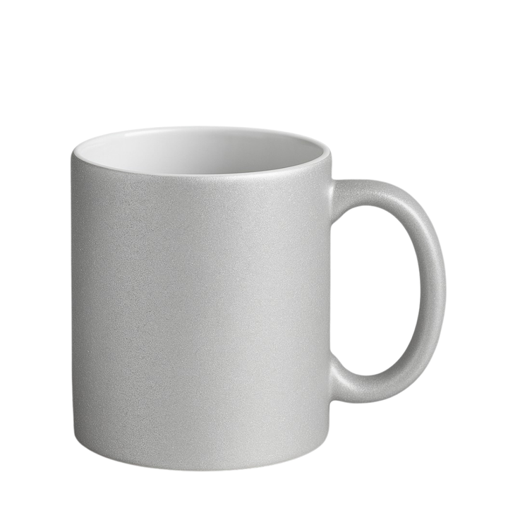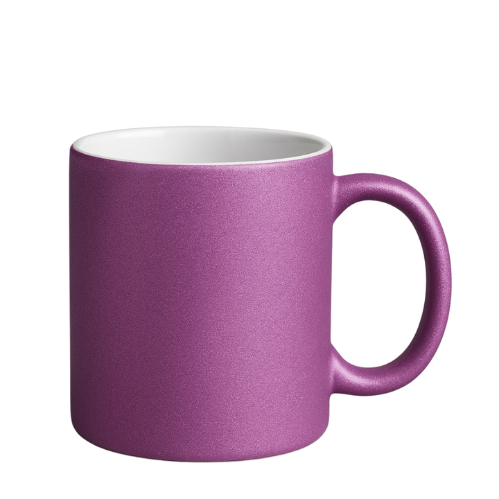Mug de cerámica sublimable de 11 oz con acabado escarchado (glitter), disponible en varios colores metálicos como plateado, dorado, rosado y cobre. Su textura brillante da un efecto visual impactante al personalizar logos o mensajes, haciendo de cada pieza un detalle especial. Ideal para campañas premium, branding conmemorativo o fechas especiales con enfoque institucional.
