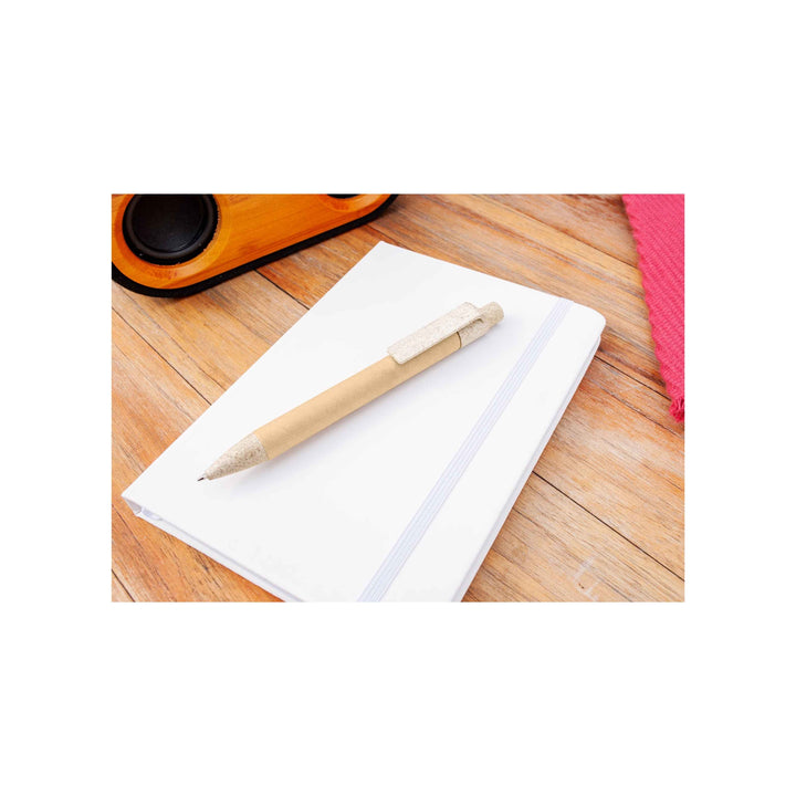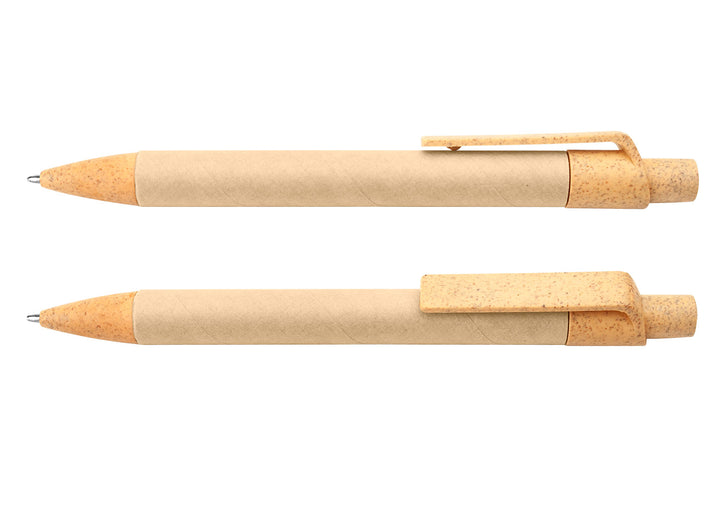 El KraftWheat Duo Click combina estética natural y funcionalidad diaria. Cuerpo central en cartón reciclado con tacto kraft y extremos en paja de trigo (clip y punta) para un look orgánico y ligero. El mecanismo retráctil permite uso ágil en ferias, oficinas y kits de onboarding, manteniendo una imagen sostenible y coherente con tu marca.