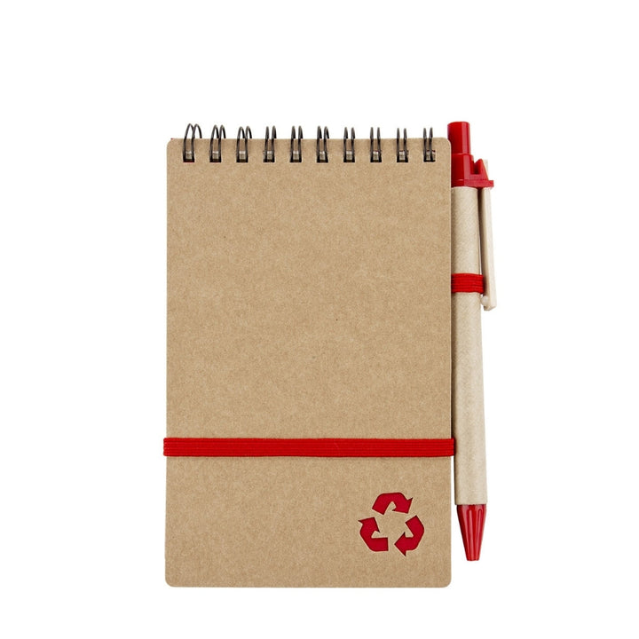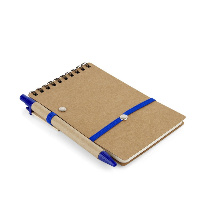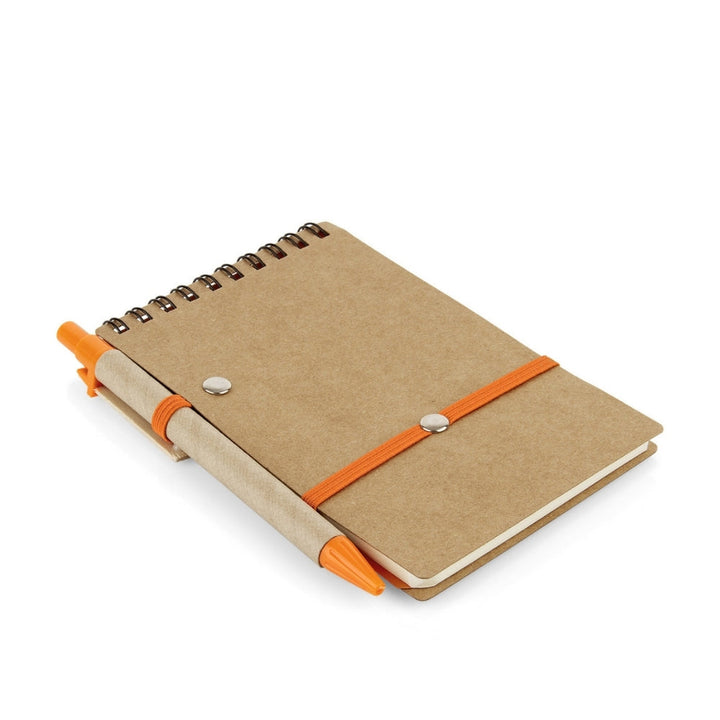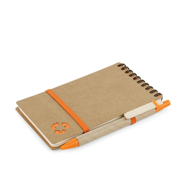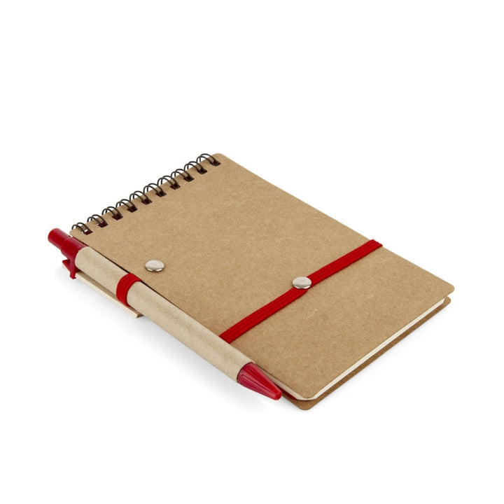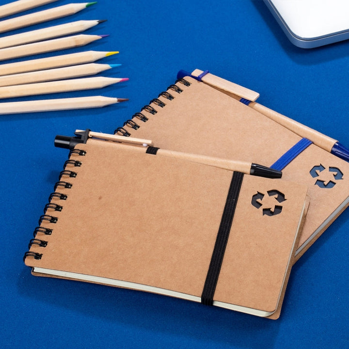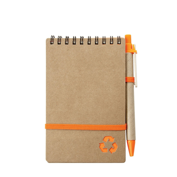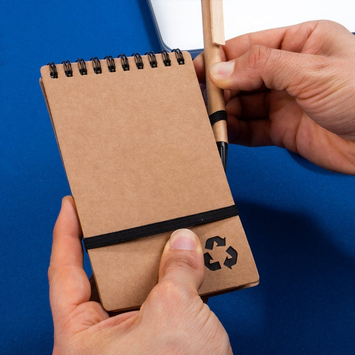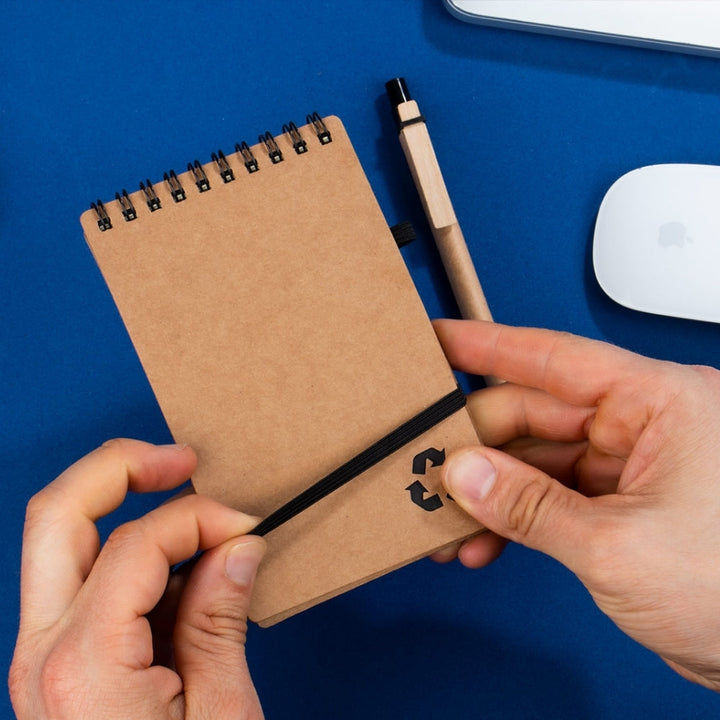 Libreta de bolsillo con 68 hojas blancas tamaño A6, encuadernada con anillo metálico doble “O” y cubierta en cartón reciclado. Incorpora banda elástica de sujeción y porta bolígrafo lateral. Incluye bolígrafo con cuerpo de cartón y componentes plásticos en colores combinados. Es una solución funcional y sostenible para dotaciones, ferias, capacitaciones internas o campañas con enfoque en responsabilidad ambiental.