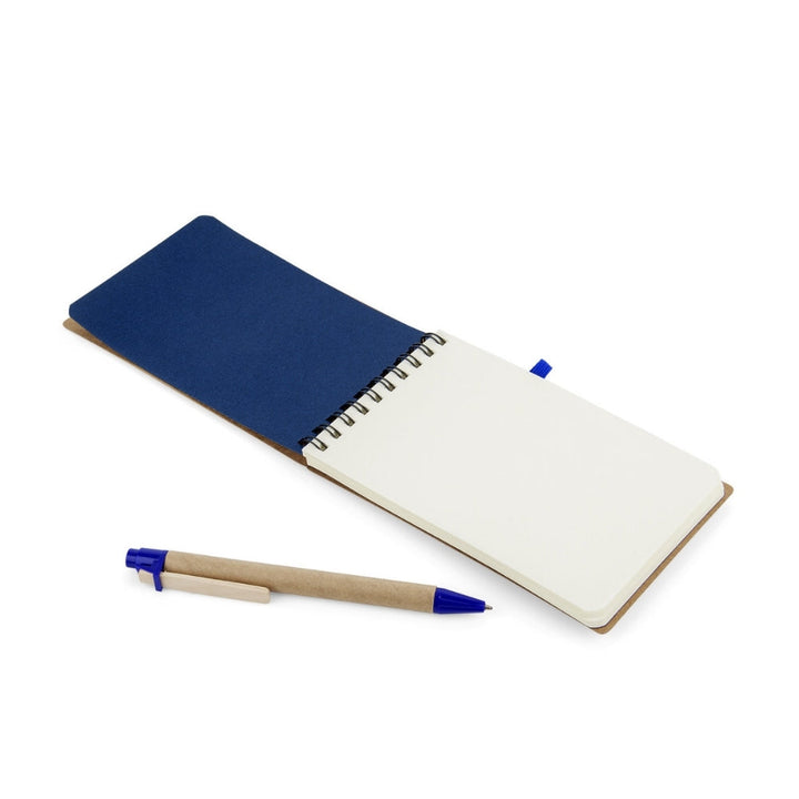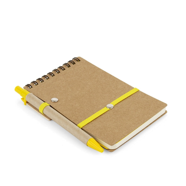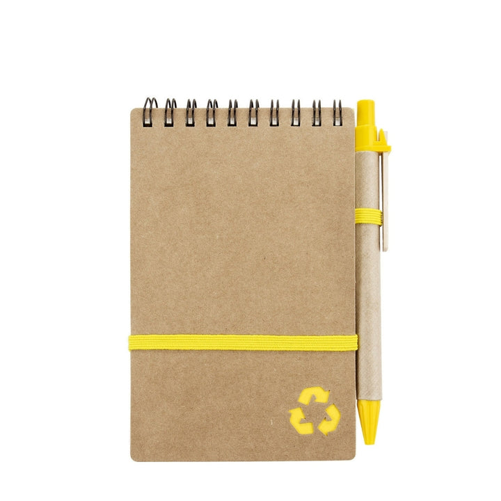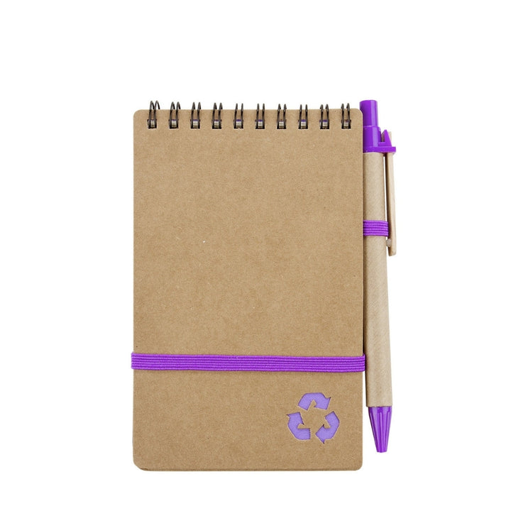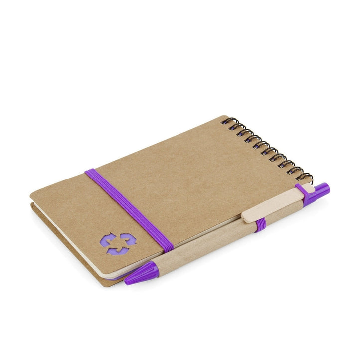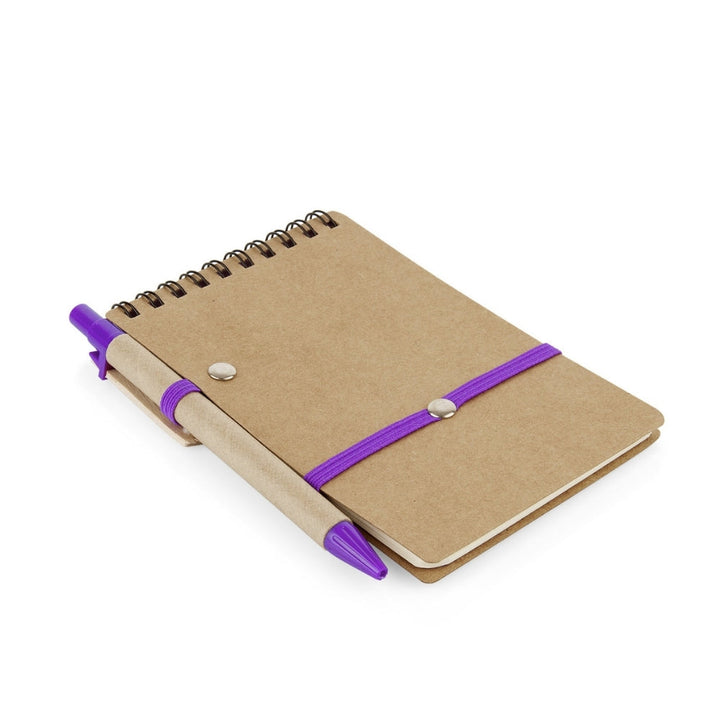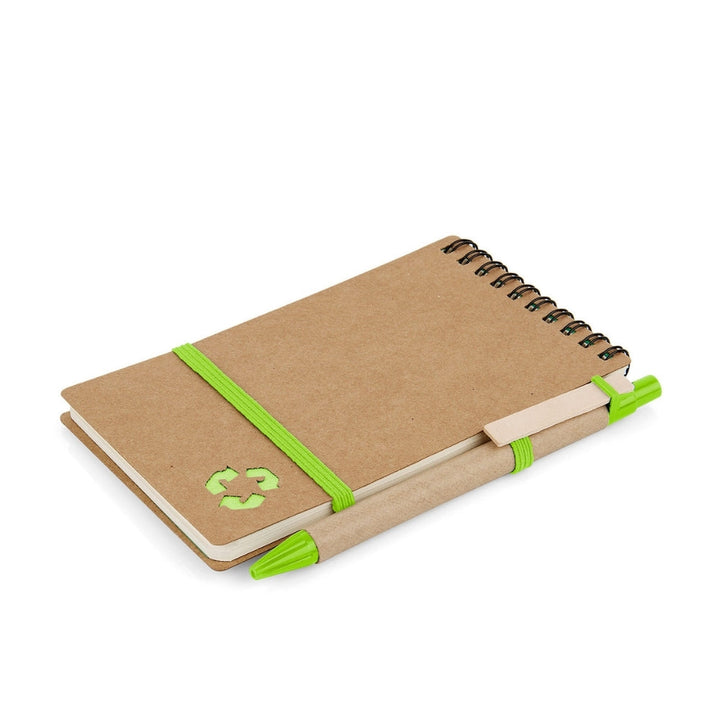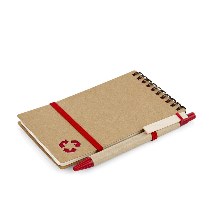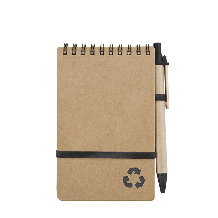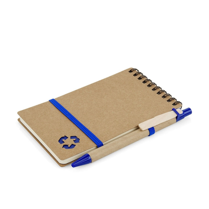 Libreta de bolsillo con 68 hojas blancas tamaño A6, encuadernada con anillo metálico doble “O” y cubierta en cartón reciclado. Incorpora banda elástica de sujeción y porta bolígrafo lateral. Incluye bolígrafo con cuerpo de cartón y componentes plásticos en colores combinados. Es una solución funcional y sostenible para dotaciones, ferias, capacitaciones internas o campañas con enfoque en responsabilidad ambiental.