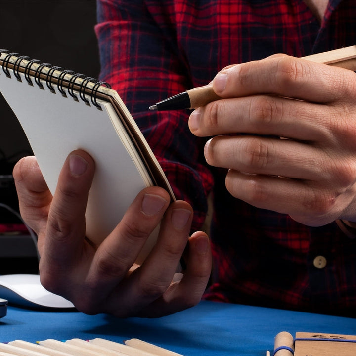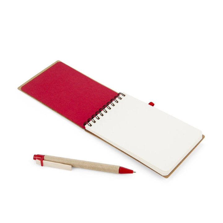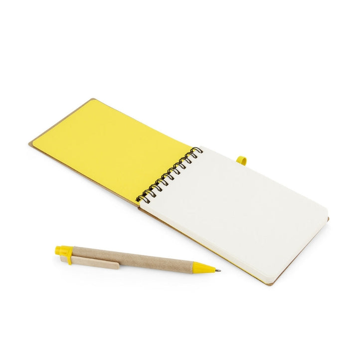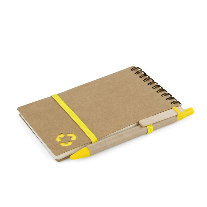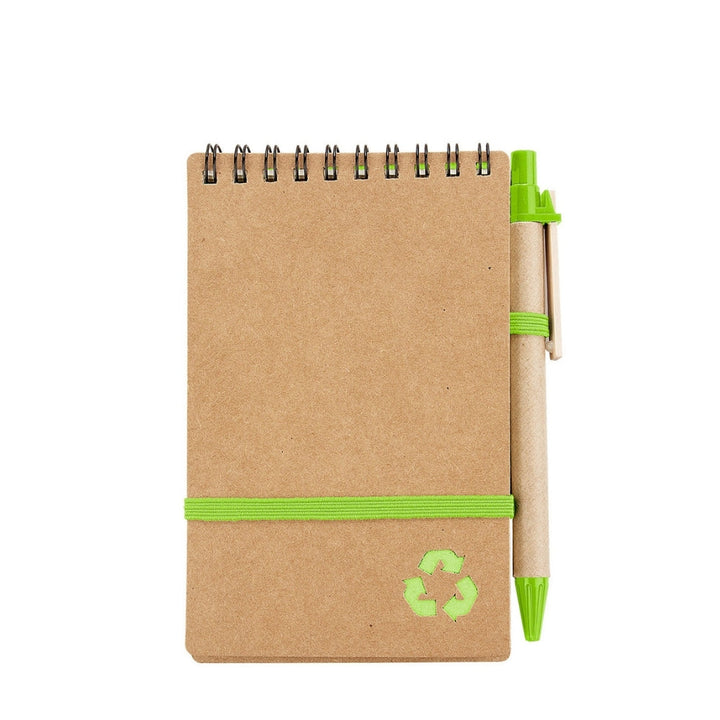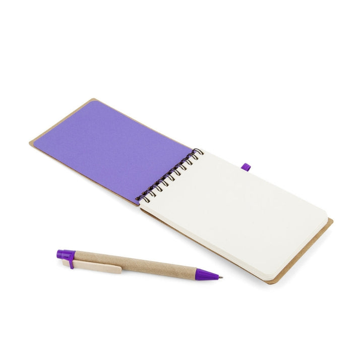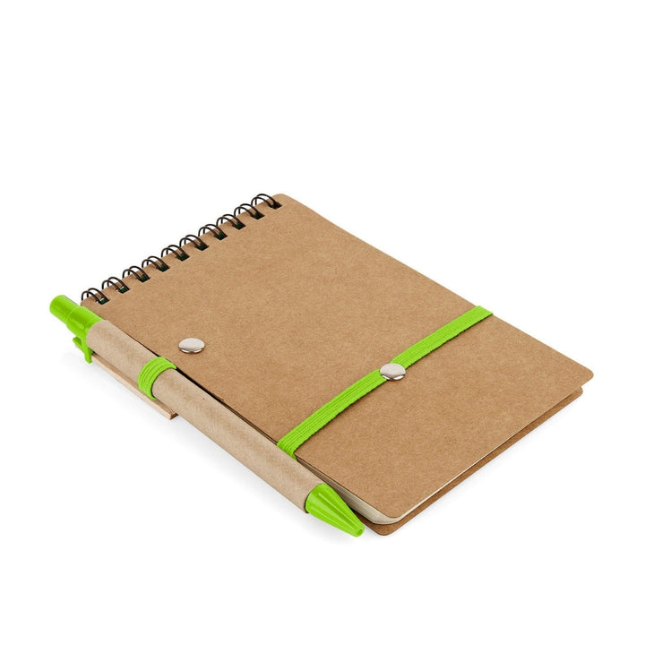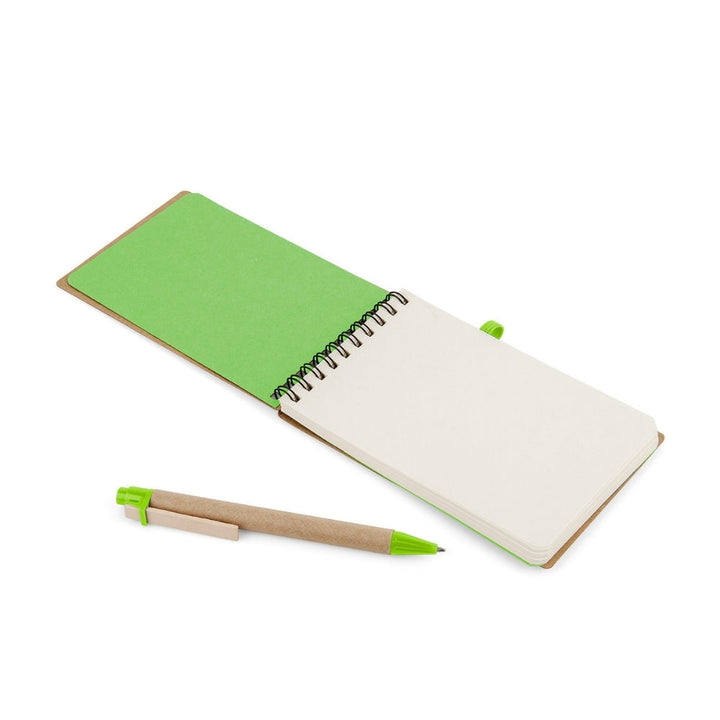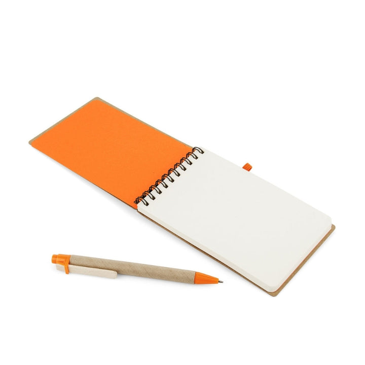 Libreta de bolsillo con 68 hojas blancas tamaño A6, encuadernada con anillo metálico doble “O” y cubierta en cartón reciclado. Incorpora banda elástica de sujeción y porta bolígrafo lateral. Incluye bolígrafo con cuerpo de cartón y componentes plásticos en colores combinados. Es una solución funcional y sostenible para dotaciones, ferias, capacitaciones internas o campañas con enfoque en responsabilidad ambiental.