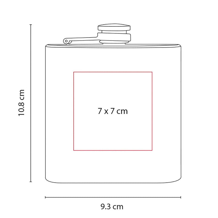 Licorera de bolsillo en acero inoxidable con capacidad de 177 ml, ideal para regalos ejecutivos, kits institucionales o eventos de fidelización premium. Su diseño compacto con tapa de rosca garantiza portabilidad y cierre seguro, evitando derrames. Superficie amplia de 7 × 7 cm para personalización con grabado láser, serigrafía o tampografía.