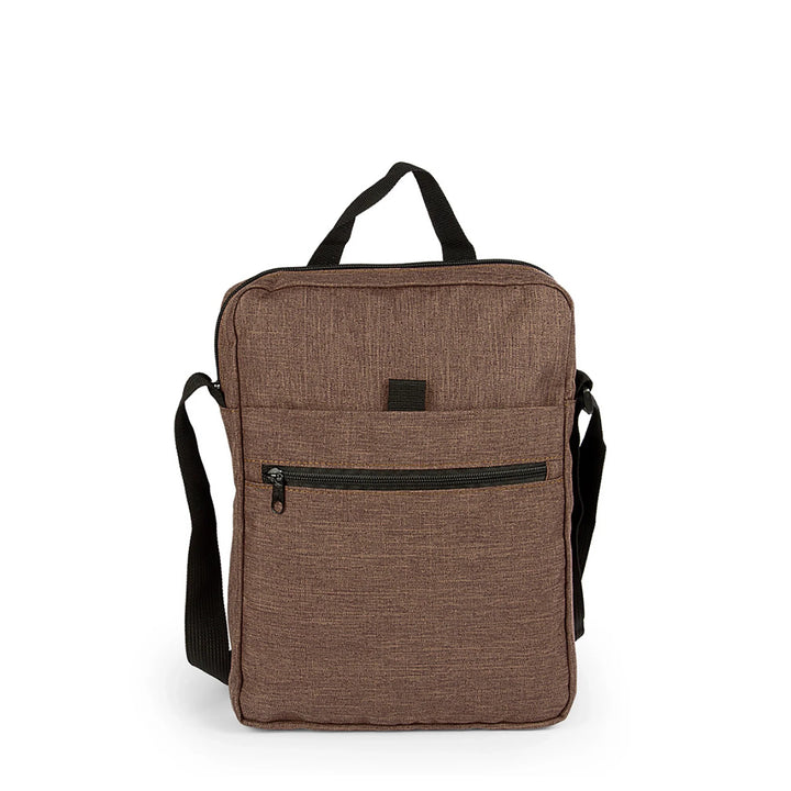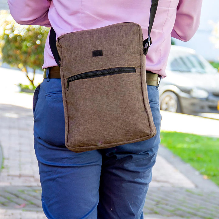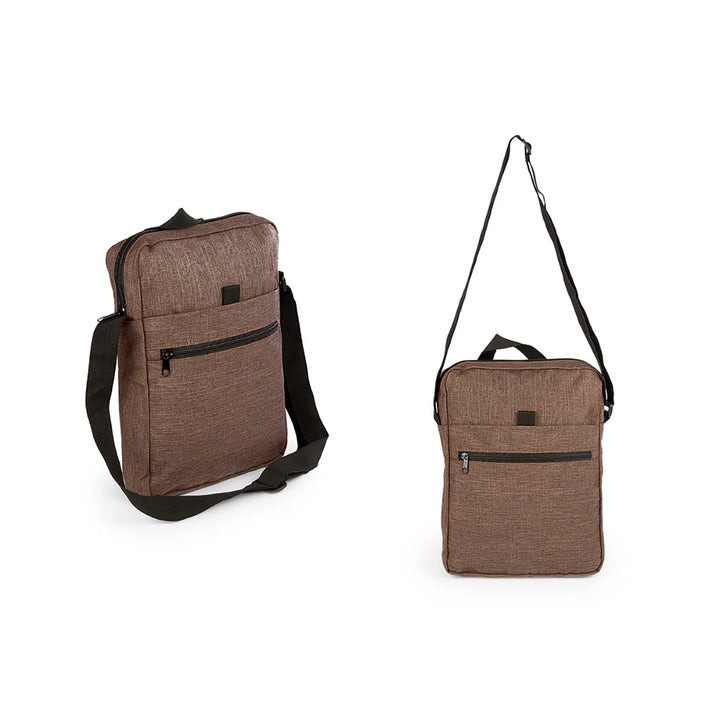 Bolso manos libres en poliéster tipo snow 600D con correa ajustable de 120 cm y agarradera superior de 16 cm. Incluye tres compartimientos: bolsillo principal y frontal con cierre en cremallera, y bolsillo intermedio con velcro para fácil acceso. Diseño compacto y funcional, ideal para eventos corporativos, uso urbano o dotaciones prácticas para colaboradores. Disponible en colores sobrios y personalizable con serigrafía hasta 3 tintas.