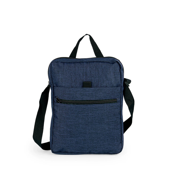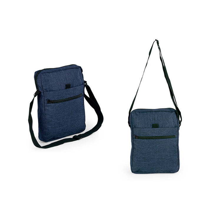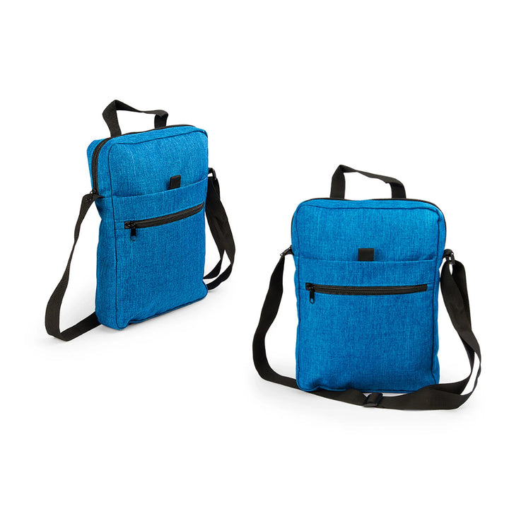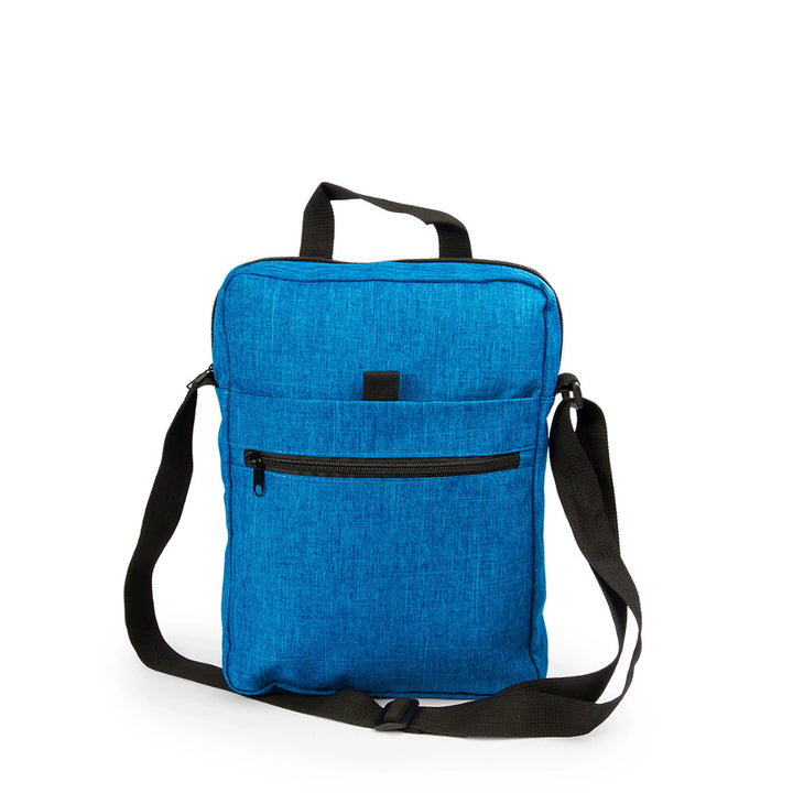 • Material: Poliéster 600D / PVC tipo snow • Medidas: 23 × 32 × 5 cm • Longitud de correa: 120 cm / Manija superior: 16 cm • Bolsillo principal y frontal con cremallera • Bolsillo intermedio con velcro • Área de impresión: 15 × 8 cm • Técnica recomendada: Serigrafía hasta 3 tintas • Colores disponibles: Azul Claro, Azul Oscuro, Café