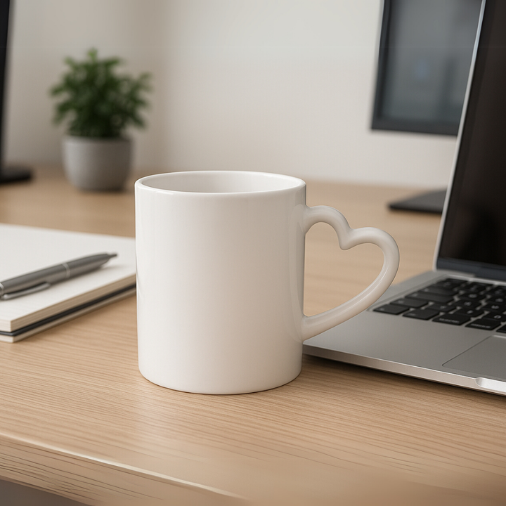 Mug de cerámica blanca con capacidad de 11 oz (325 ml), diseñado para sublimación completa. Su diferencia está en el diseño del asa en forma de corazón, lo que lo hace ideal para campañas de afecto, reconocimiento interno o fechas conmemorativas. Perfecto para personalización creativa con frases, imágenes o mensajes que conectan con el usuario.