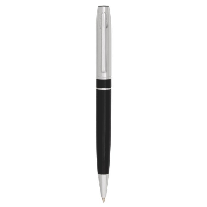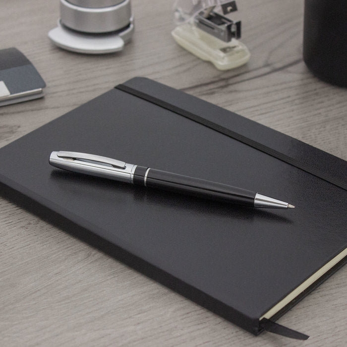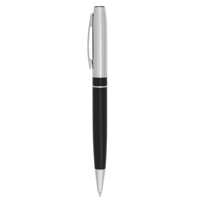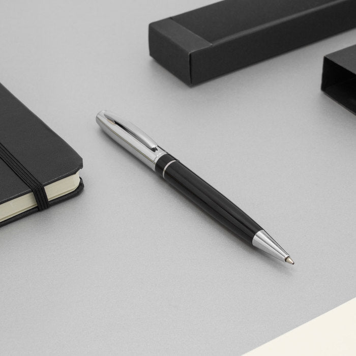 El Onyx Twist es un bolígrafo ejecutivo de apertura giratoria que combina cuerpo metálico negro mate con detalles plata para un look sobrio y profesional. Incorpora puntera, clip y anillo metálicos, más destape electroplateado en la parte superior que protege el brillo y la durabilidad.