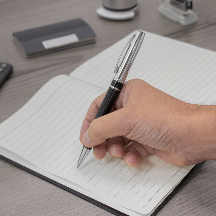 La zona inferior texturizada mejora el agarre y el control del trazo en reuniones o firmas prolongadas. Escribe con tinta negra de flujo uniforme y recarga metálica tipo premium. Se entrega en caja de regalo, listo para branding corporativo y kits ejecutivos.