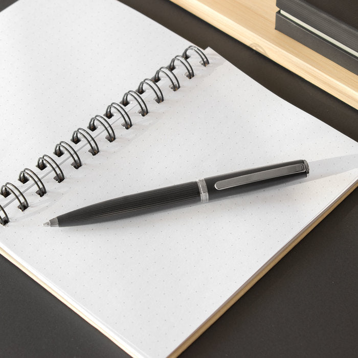 El Onyx Twist es un bolígrafo ejecutivo de apertura giratoria que combina cuerpo metálico negro mate con detalles plata para un look sobrio y profesional. Incorpora puntera, clip y anillo metálicos, más destape electroplateado en la parte superior que protege el brillo y la durabilidad.