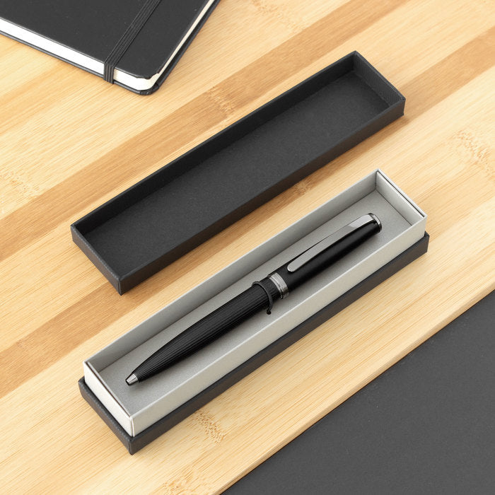 La zona inferior texturizada mejora el agarre y el control del trazo en reuniones o firmas prolongadas. Escribe con tinta negra de flujo uniforme y recarga metálica tipo premium. Se entrega en caja de regalo, listo para branding corporativo y kits ejecutivos.