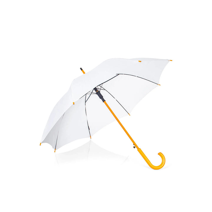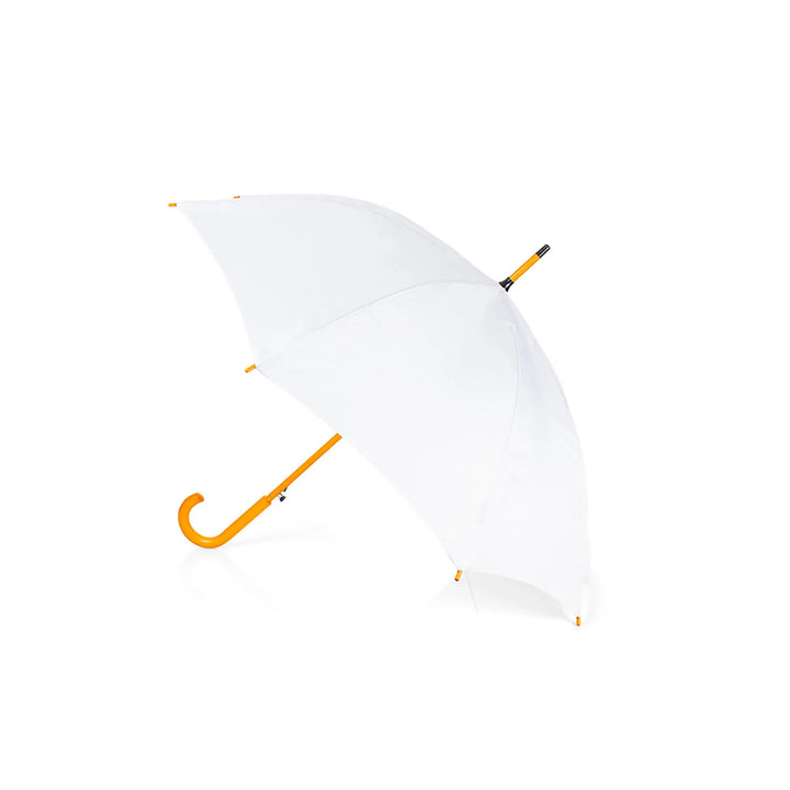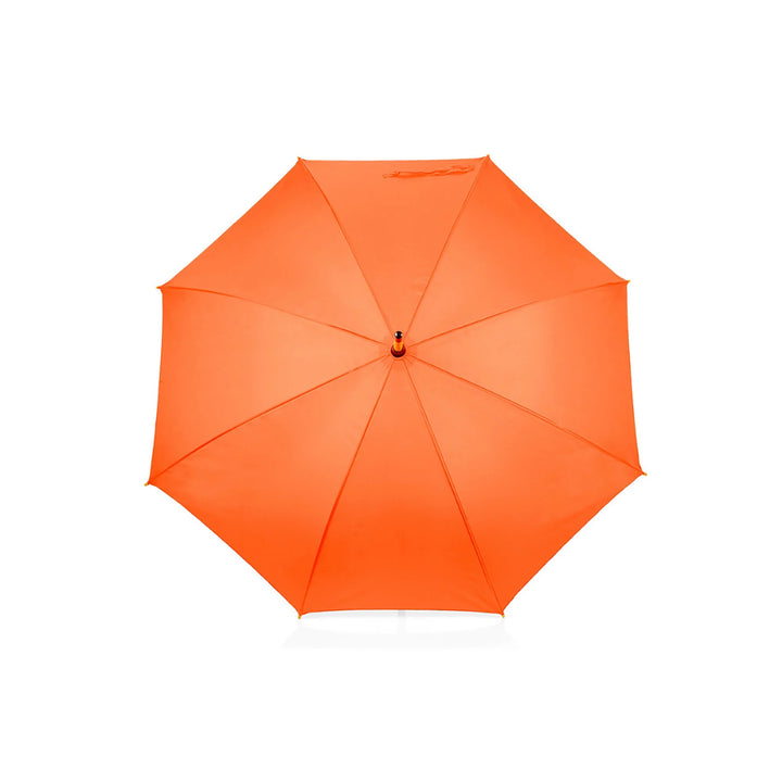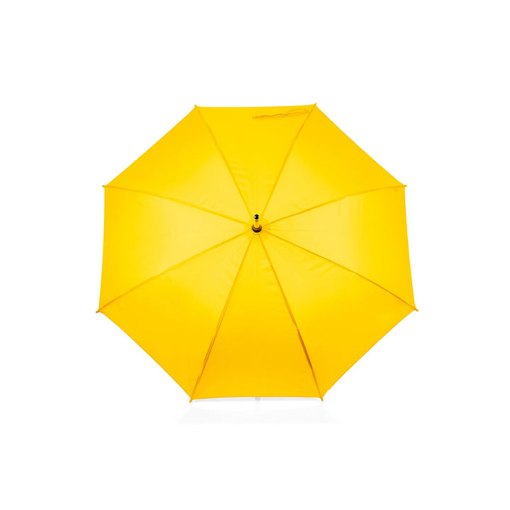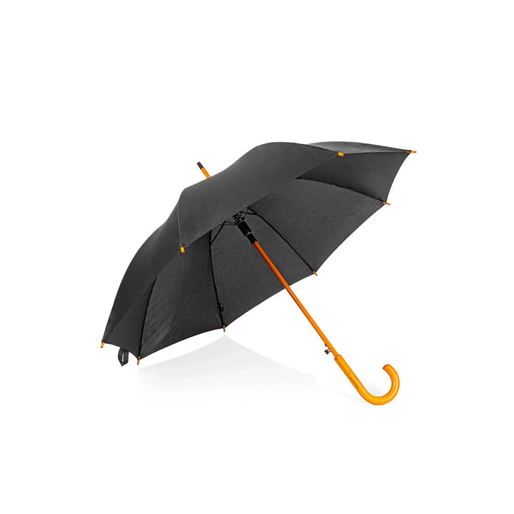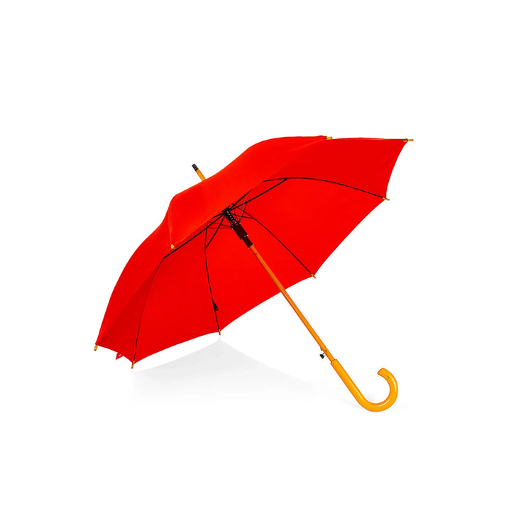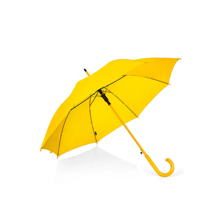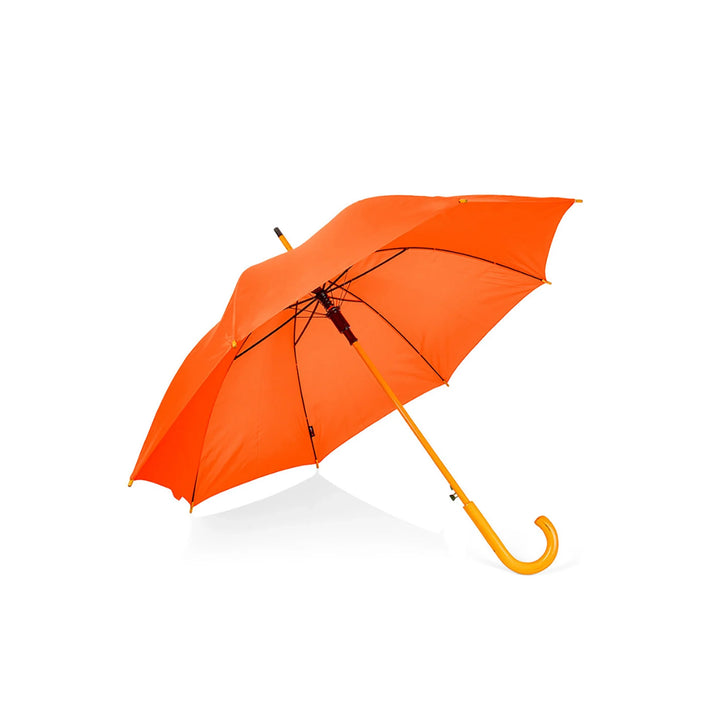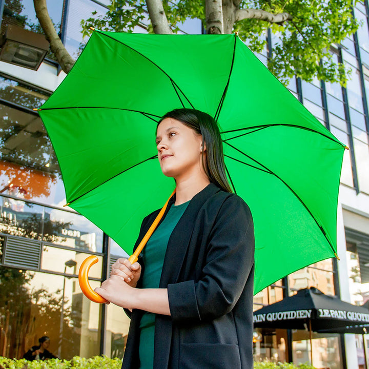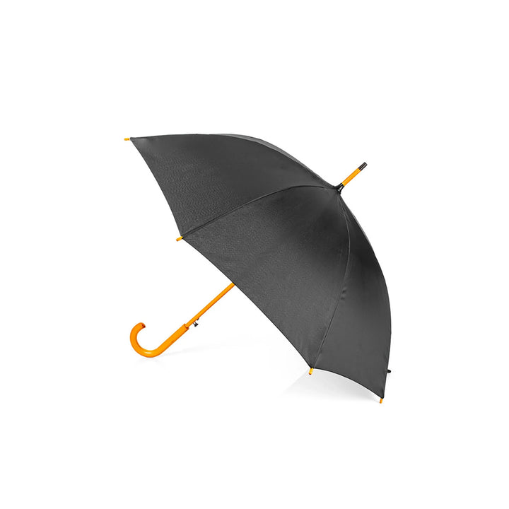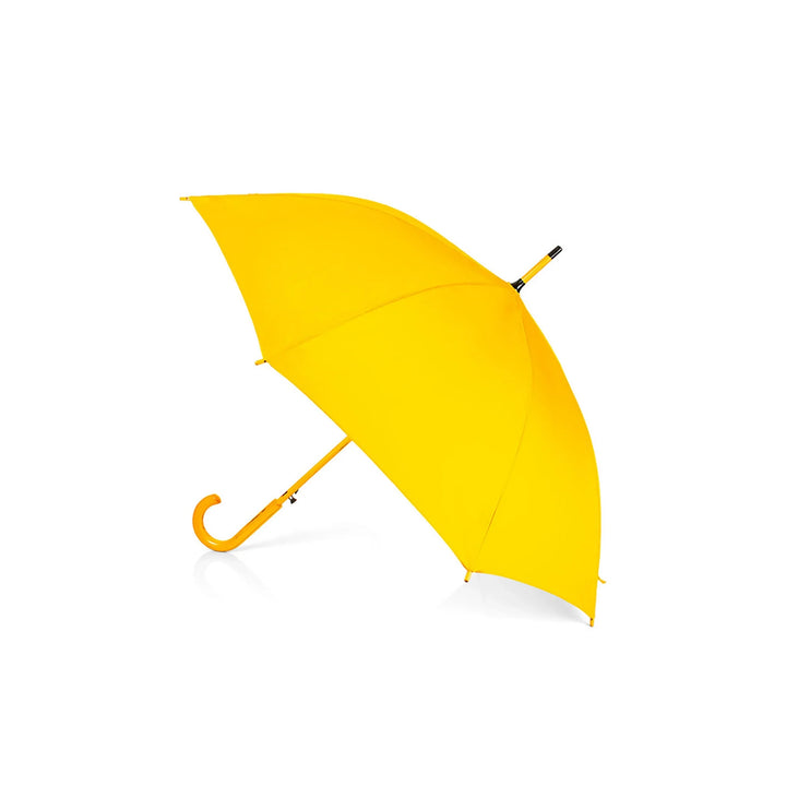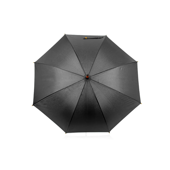 Paraguas largo de 23 pulgadas con mango curvo y apertura automática, ideal para eventos corporativos, dotaciones premium o regalos institucionales de alto valor. Su estructura reforzada con 8 cascos, tela Pongee y acabados negros le da un aspecto elegante y profesional. El mango curvo y botón de cierre están fabricados en madera, lo que aporta distinción sin comprometer funcionalidad. Su cobertura amplia (100 cm) protege en días lluviosos y crea una superficie visual de alto impacto para logotipos. Acepta impresión en screen hasta 3 tintas sobre un área de 20 x 13 cm.