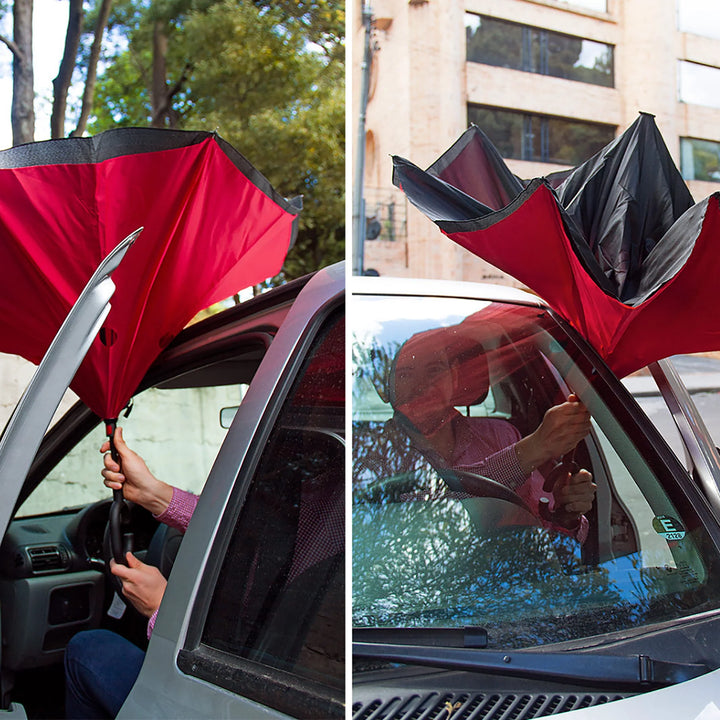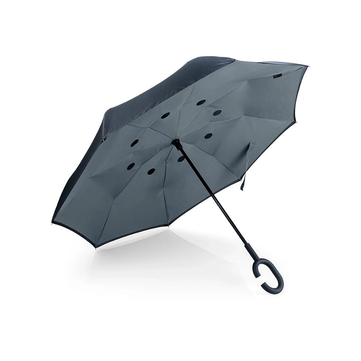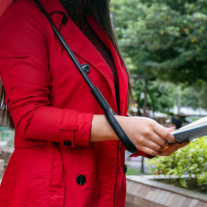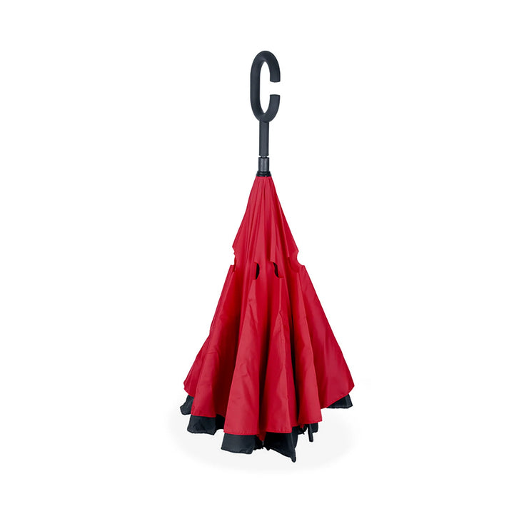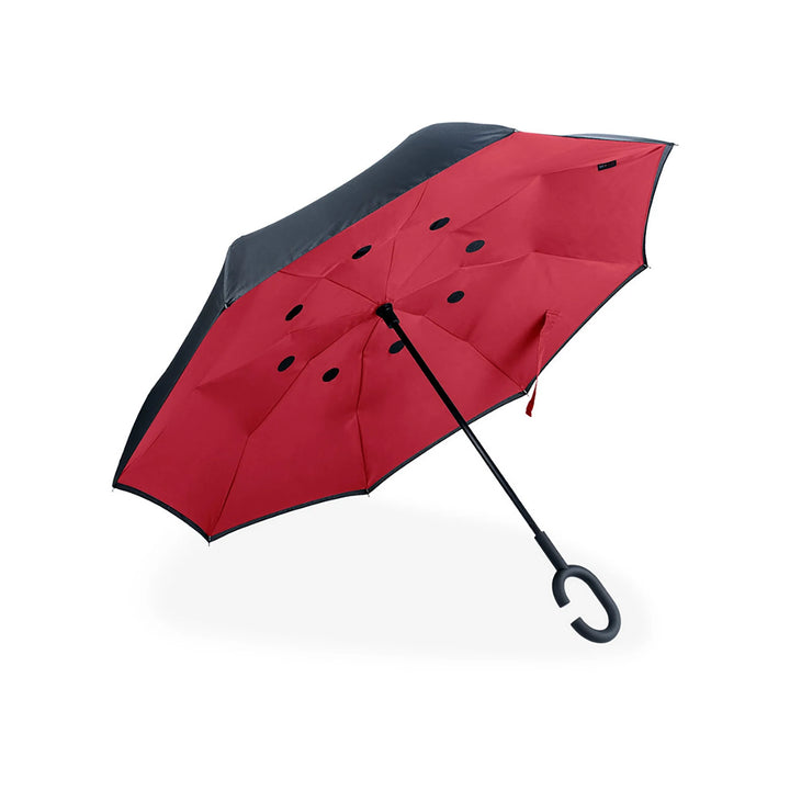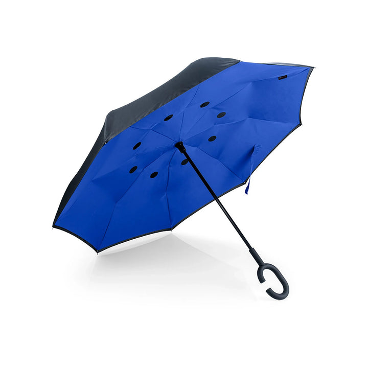 Paraguas de 23 pulgadas con mecanismo de plegado inverso y diseño bicolor, ideal para entornos urbanos, regalos corporativos de alto perfil o dotaciones elegantes. Su apertura invertida permite cerrar el paraguas sin derramar agua en interiores, mientras que el mango tipo C con recubrimiento en goma permite colgarlo del brazo para usar el celular o cargar objetos. Fabricado en tela 190T pongee con estructura metálica y costillas mixtas de fibra de vidrio, ofrece resistencia y comodidad en jornadas prolongadas. Incluye cierre con velcro y funda del mismo color.