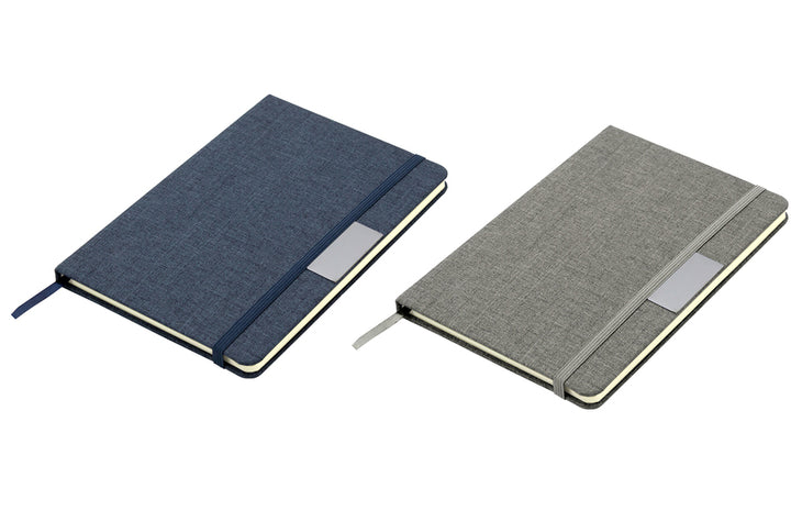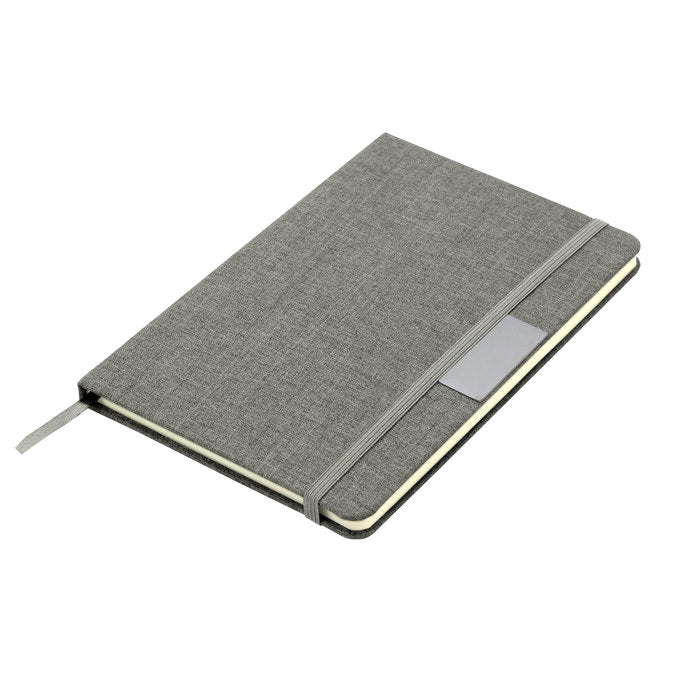 Incluye una placa metálica de 5 × 2 cm, perfecta para personalización con logo mediante grabado láser o tampografía. Su interior de 80 hojas rayadas en papel obra de 70 g proporciona una escritura suave y uniforme. El encuadernado cosido y la banda elástica del mismo tono garantizan durabilidad y orden.