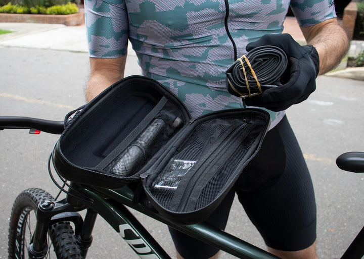 Se fija al tubo superior con estabilidad, incorpora pasador para audífonos y una placa metálica lista para grabado láser. Ideal para commuting, gravel y entregas en ciudad.