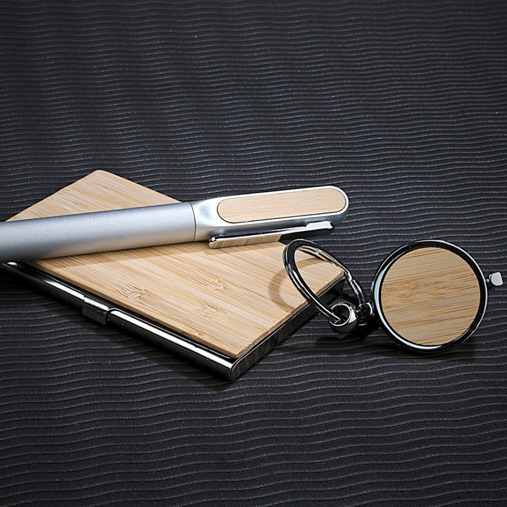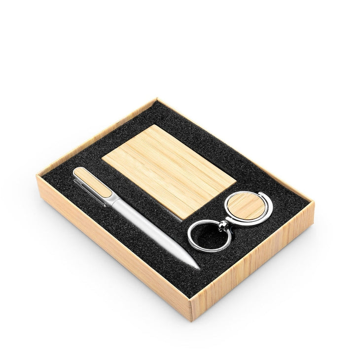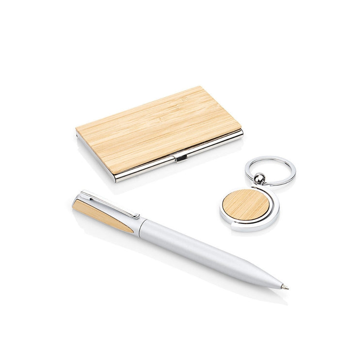 Set compacto de presentación corporativa ideal para eventos, ferias o kits de bienvenida. Incluye tarjetero metálico con frontal en bambú, bolígrafo de aluminio con sistema twist y clip grabable, y llavero metálico circular con inserto de bambú. Todos los elementos son aptos para grabado láser y vienen organizados en estuche rígido forrado en papel con acabado imitación bambú. Su diseño liviano y práctico lo convierte en una opción funcional para campañas promocionales o regalos institucionales de volumen medio.