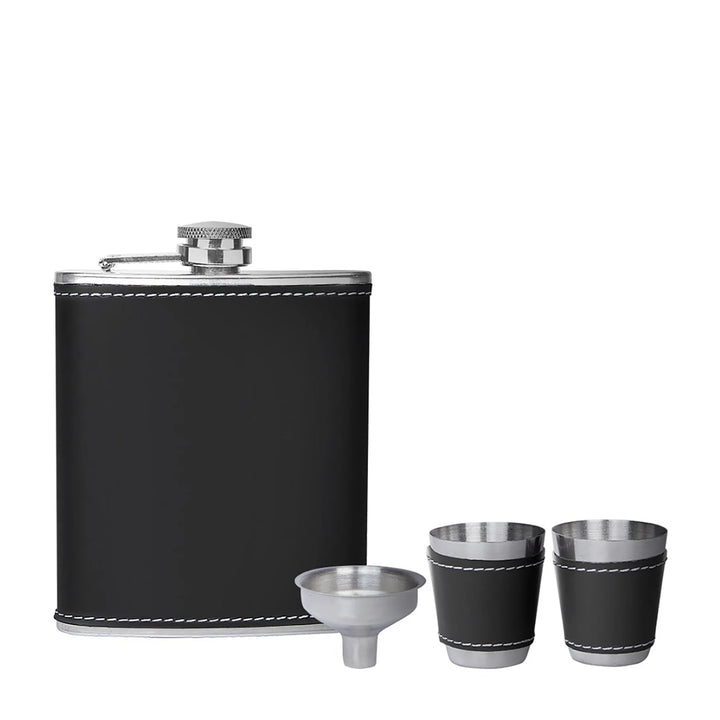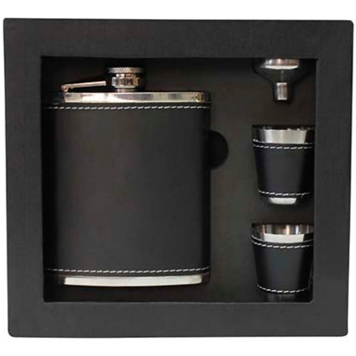 Set licorero de presentación ejecutiva compuesto por licorera de acero inoxidable con capacidad de 196 ml, dos vasos metálicos con recubrimiento en curpiel negro, embudo metálico y caja individual de regalo. La tapa a rosca evita derrames, lo que lo convierte en una opción práctica para obsequios institucionales, aniversarios de empresa o campañas de fidelización premium. Apto para personalización con grabado láser en cuerpo de licorera y vasos.