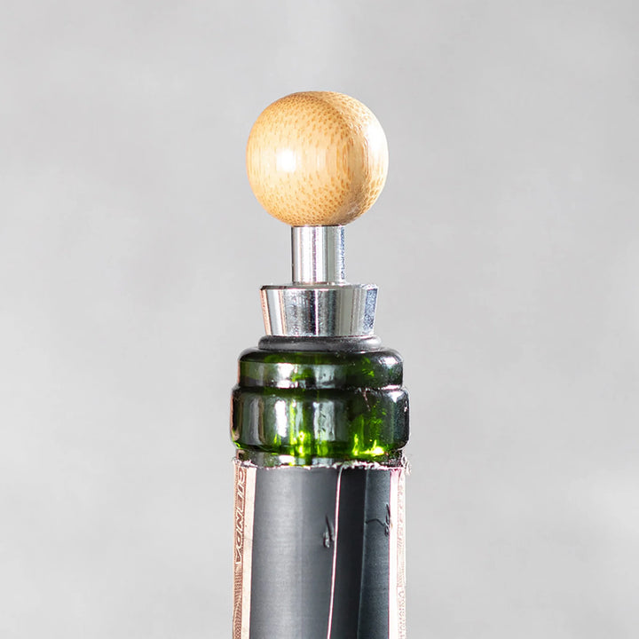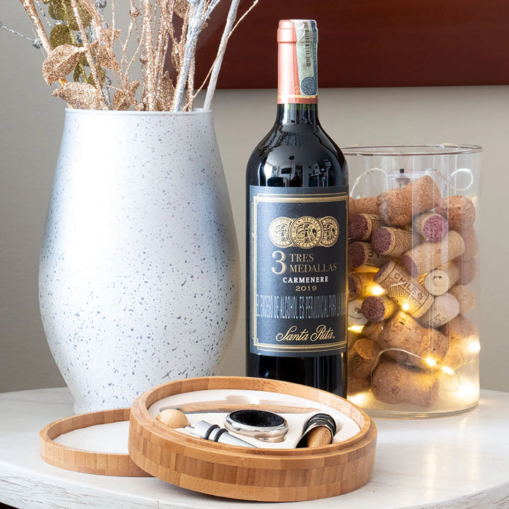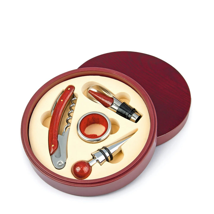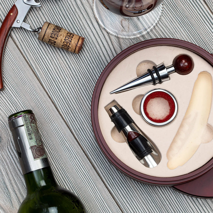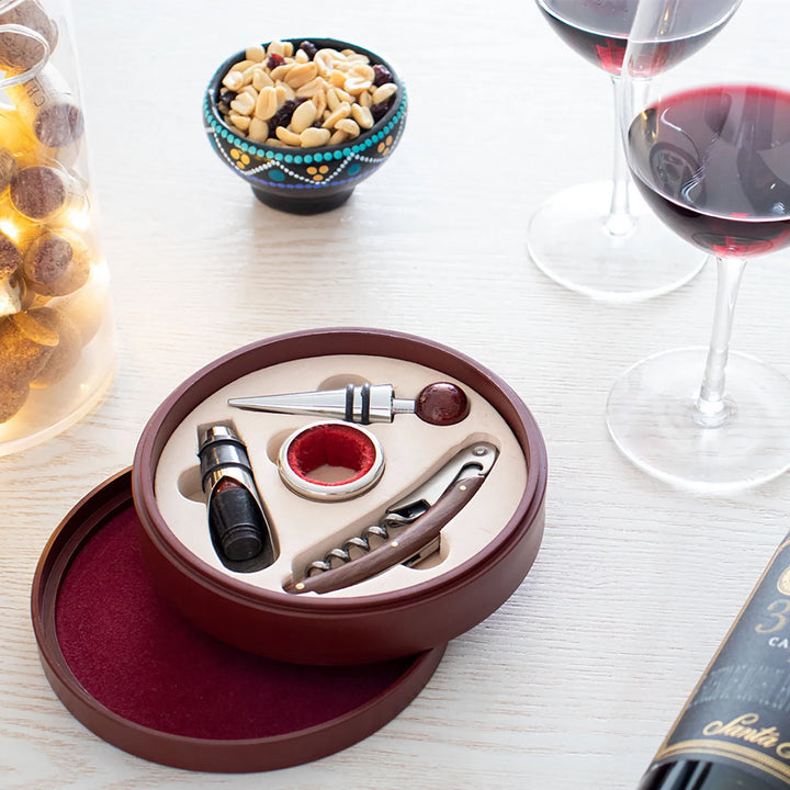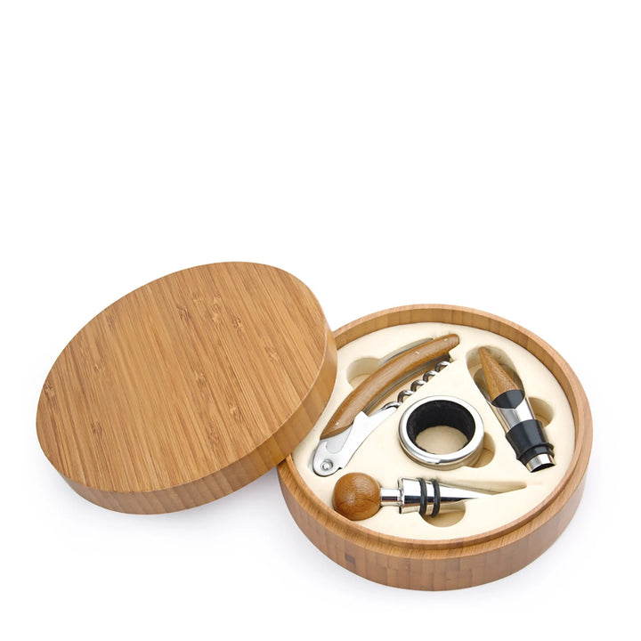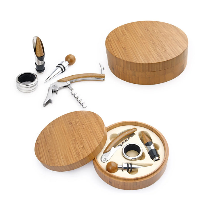 Un clásico infaltable para verdaderos wine lovers. Este elegante set redondo incluye 4 accesorios esenciales con detalles en madera: tapón metálico, aro antigoteo, cortagotas y sacacorchos de un tiempo. Todo viene en una caja de bambú con interior en tono beige, ideal para regalos corporativos, celebraciones o experiencias de marca.