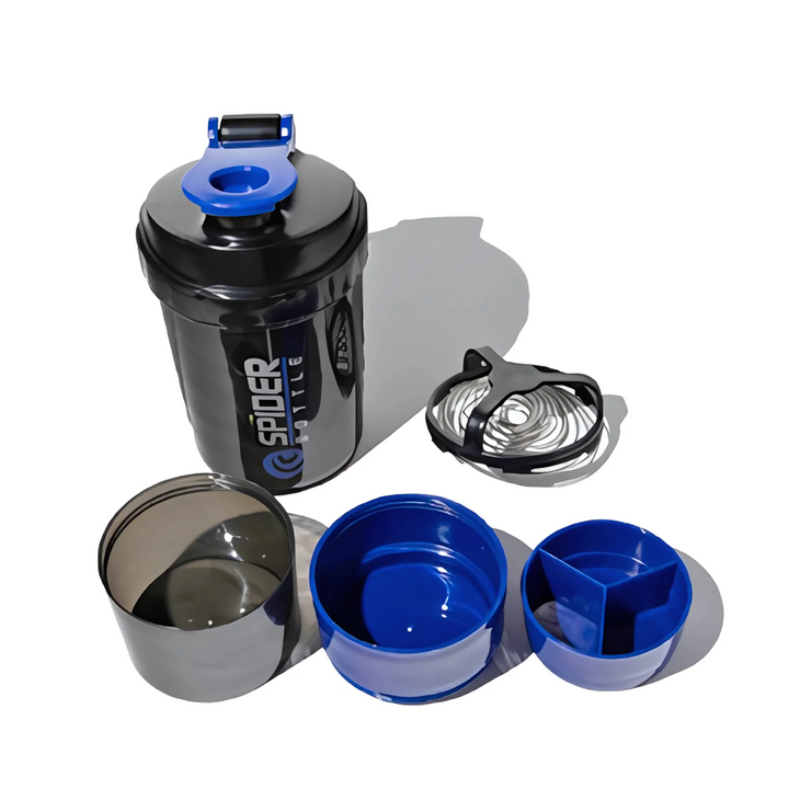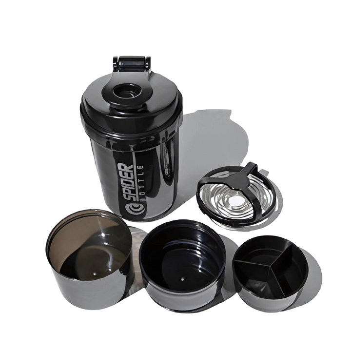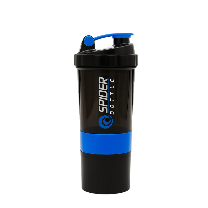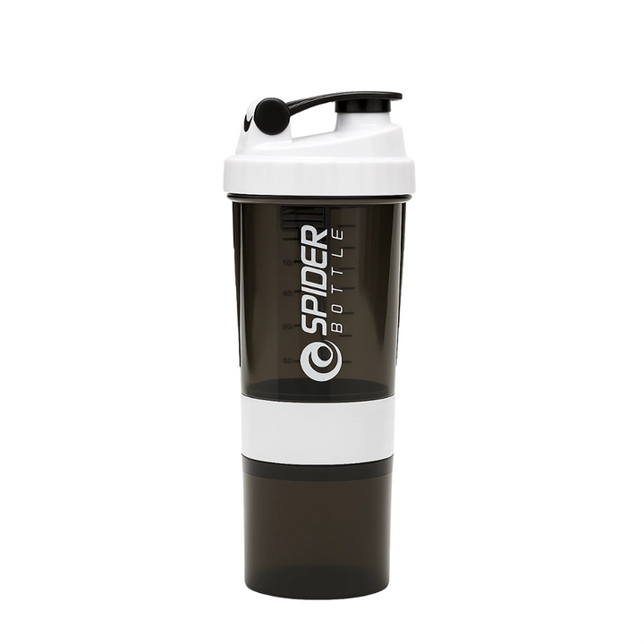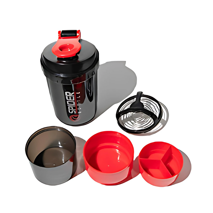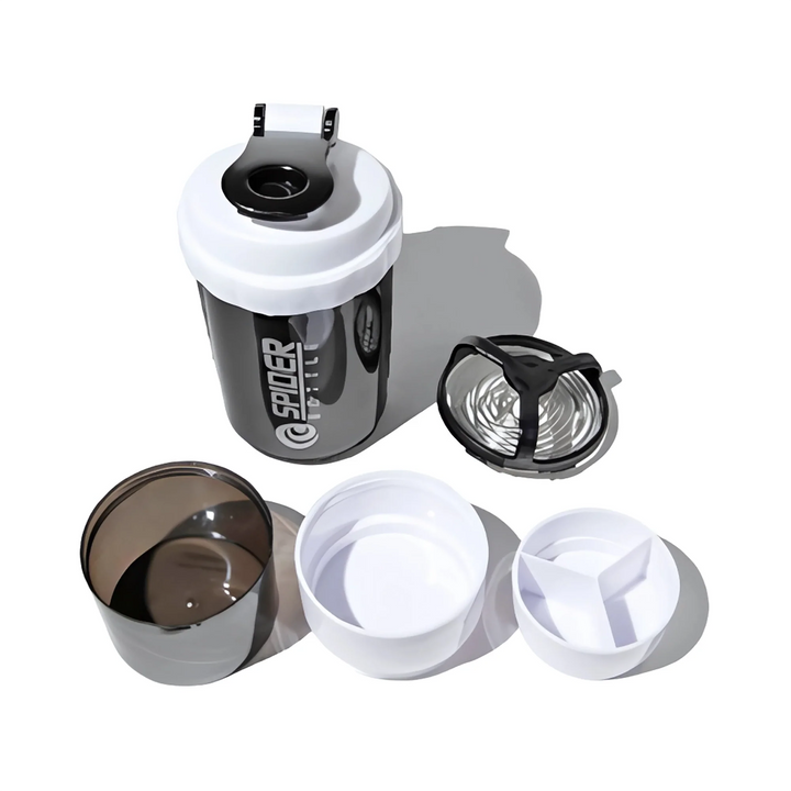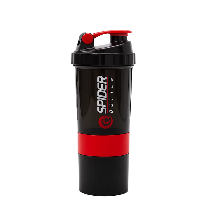 • Capacidad: 500 ml • Sistema shaker con rejilla mezcladora en espiral • 2 compartimentos inferiores desmontables (polvo / cápsulas) • Cierre seguro tipo snap con boquilla ergonómica • Apto para bebidas frías y suplementos en polvo • Colores según disponibilidad: negro, rojo, blanco, azul • Cuerpo translúcido en tono humo con marcación Spider Bottle • Ideal para dotaciones deportivas, bienestar laboral y fidelización activa