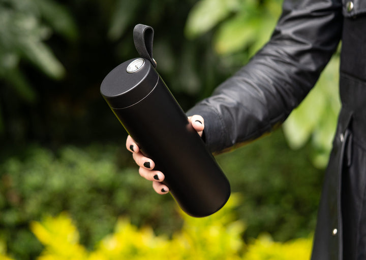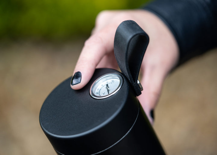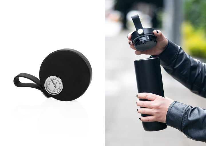 La ThermoGauge Pro 500 es una botella de acero inoxidable de doble pared al vacío con acabado mate que mantiene tus bebidas a la temperatura ideal durante la jornada. Su tapa integra indicador mecánico de temperatura para controlar el momento perfecto de consumo y una asa de silicona para transporte cómodo en ciudad o ruta.
