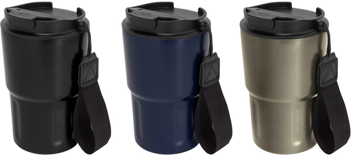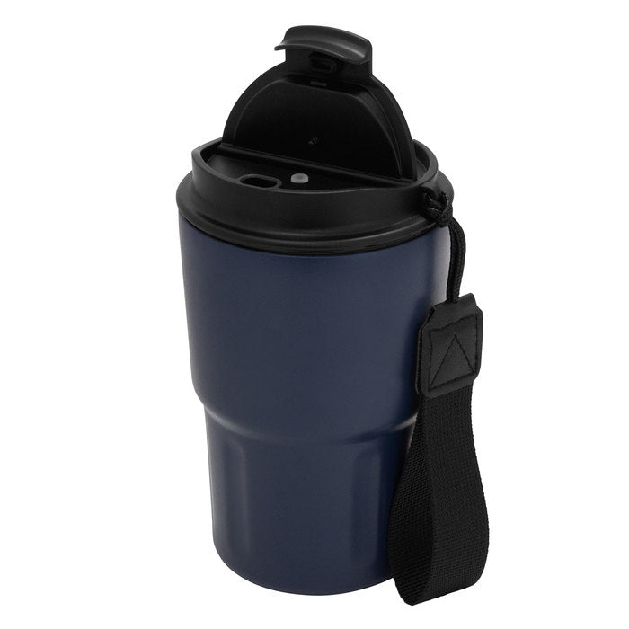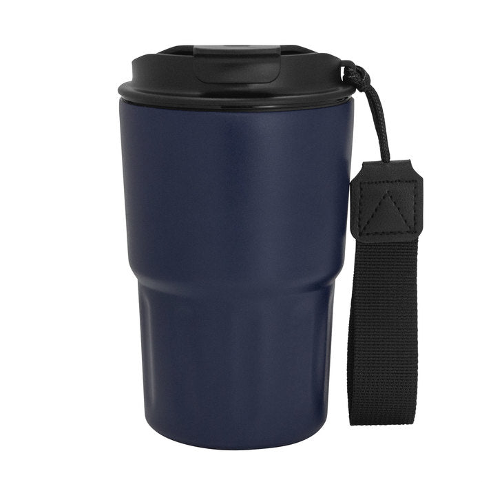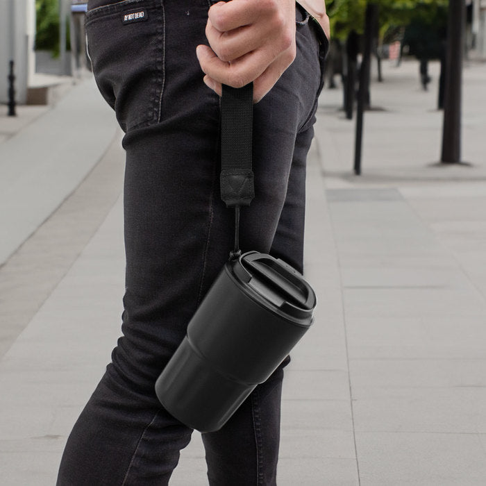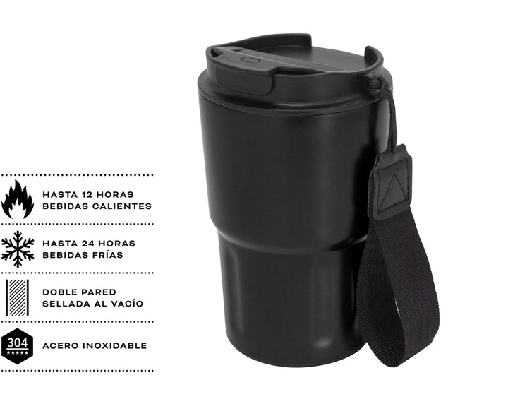 El ThermoGrip 400 está pensado para días intensos: su cuerpo de acero con doble pared sellada al vacío conserva la temperatura —hasta 12 h caliente / 24 h fría— mientras el acabado mate ofrece estética ejecutiva. La tapa de PP con sello de silicona minimiza derrames y la correa de poliéster permite llevarlo seguro en mano o mochila. Ideal para oficina, trayectos y kits de bienvenida.