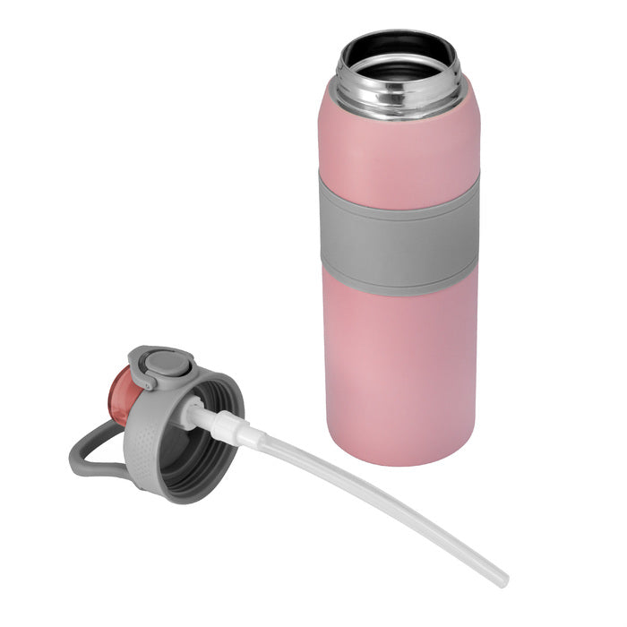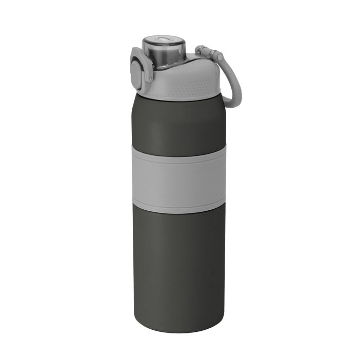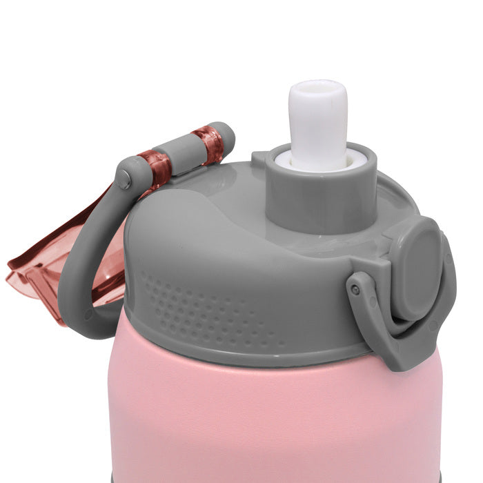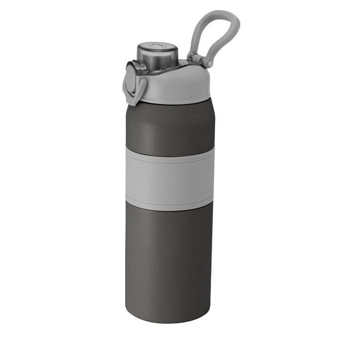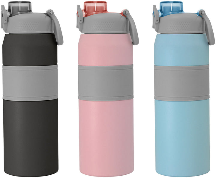 La tapa superior combina rosca segura en gris, anillo de silicona, asa ergonómica y cierre abatible translúcido con boquilla-sorbete para beber sin inclinar. El grip de silicona central mejora el agarre en movimiento—ideal para oficina, gimnasio o ruta.