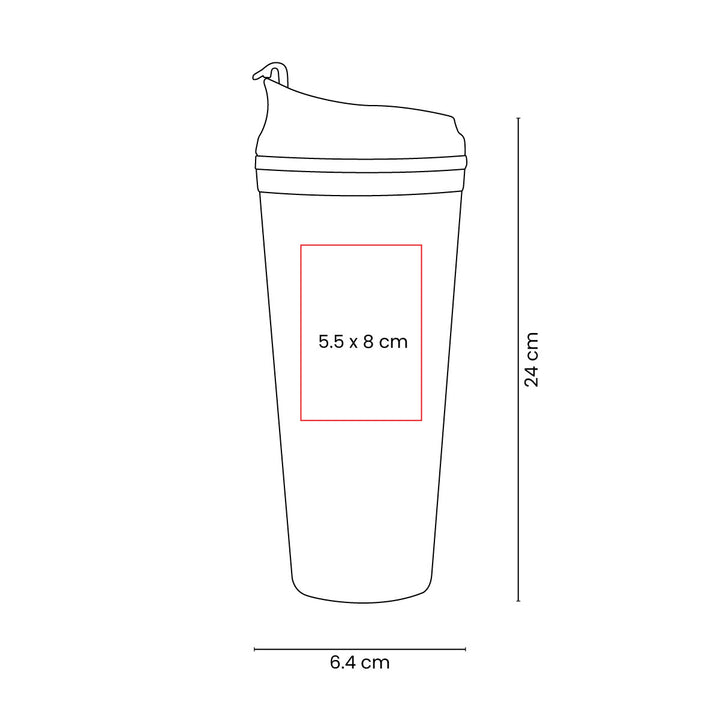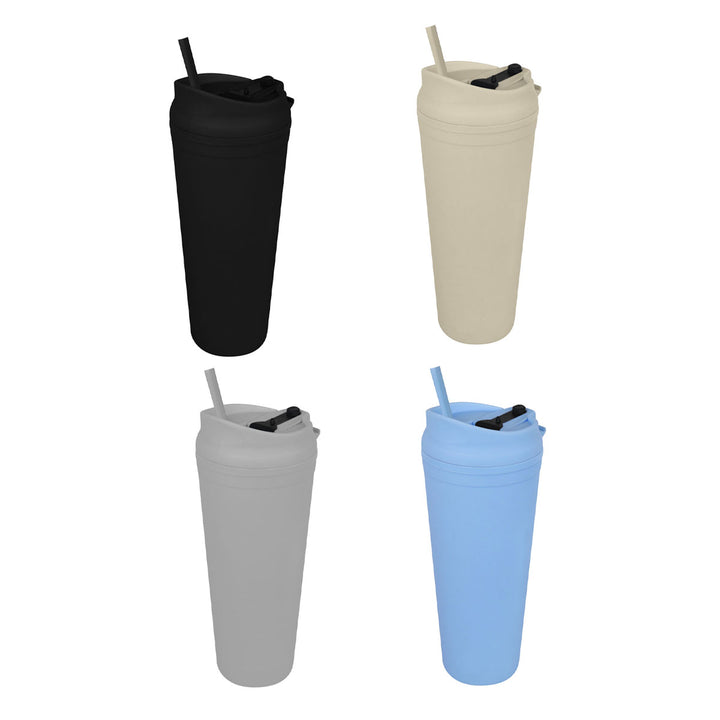 El Tumbler SoftSip Duo 665 ml es un termo plástico de doble pared con acabado tipo rubber suave al tacto. Tapa de rosca con dos modos: boquilla push para beber directo y sobre-tapa con ranura para popote (incluido) que evita derrames. Formato estilizado 6,4 × 24 cm con caja individual. Personalizable por serigrafía (área 5,5 × 8 cm), ideal para dotaciones, activaciones y programas wellness.