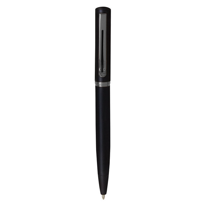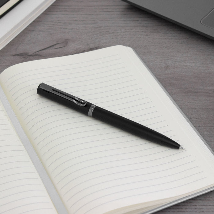 El Vanguard Twist es un bolígrafo ejecutivo de apertura giratoria con estética negra mate y detalles gunmetal que proyectan solidez y estilo. Su construcción combina hierro en la parte superior y acero inoxidable en la inferior, con destape electroplateado para mayor resistencia al uso.