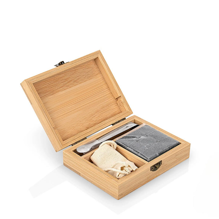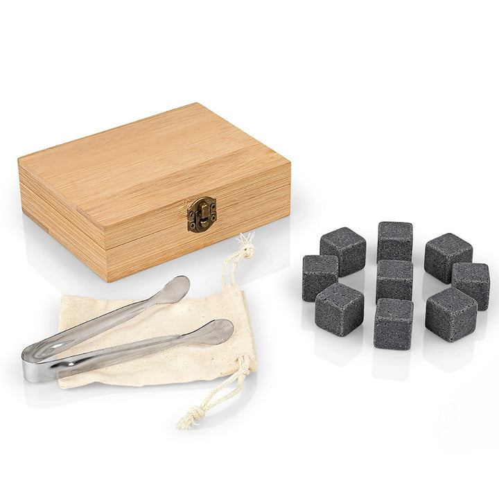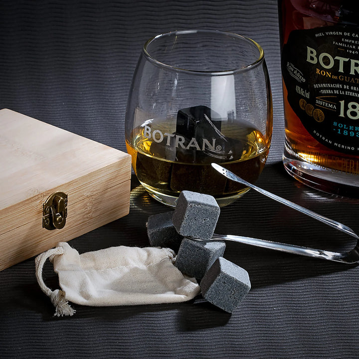Set premium para enfriar bebidas sin diluir su sabor. Incluye 9 cubos de basalto reutilizables, pinzas metálicas y bolsa de tela para almacenarlos, todo presentado en una caja rígida de bambú natural. Ideal para quienes disfrutan del whisky, ron o cócteles con estilo. Un regalo sofisticado y funcional que proyecta sostenibilidad y buen gusto. Perfecto para clientes selectos, celebraciones de marca o incentivos ejecutivos.